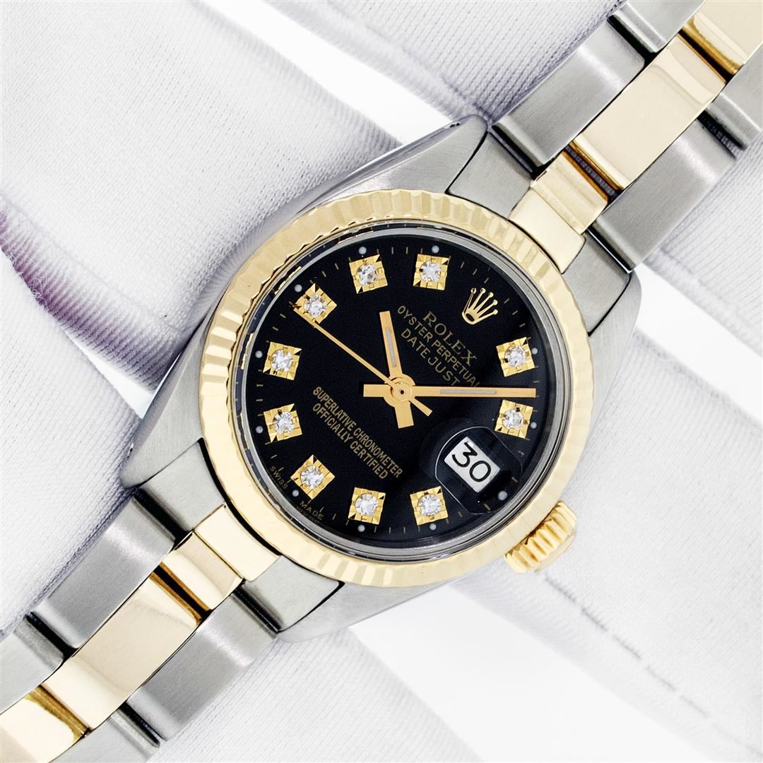 One Ladies Pre Owned Two Tone Yellow Gold And Stainless Steel Rolex Datejust Polished, Serviced & Electronically Tested, Rolex Yellow Gold & Stainless Steel Case: 26mm, Rolex Yellow Gold Crown, Rolex Bezel: Yellow Gold Fluted Bezel. Custom Crystal: New Acrylic With Magnified Date Window. Custom Hands: New Luminescent Hands. Rolex Movement: Automatic Winding Movement. Custom Dial: Refinished To Black With Added Diamonds, Diamond Count: 10 Single Cut Diamonds, Color: G to H, Clarity: VS. Date Window: 3 O'clock Position Date Display, Model: Datejust. Condition: G-6 Extra Fine. Rolex Bracelet: Two Tone Yellow Gold & Stainless Steel Oyster Band. Bright Polish. 6.0 Inch Length, Adjustable. Standard Clasp, With Rolex Logo. This Pre Owned Watch Has Been Serviced Time Tested And Is In Excellent Condition It Is Free Of All Scratches And Dents.