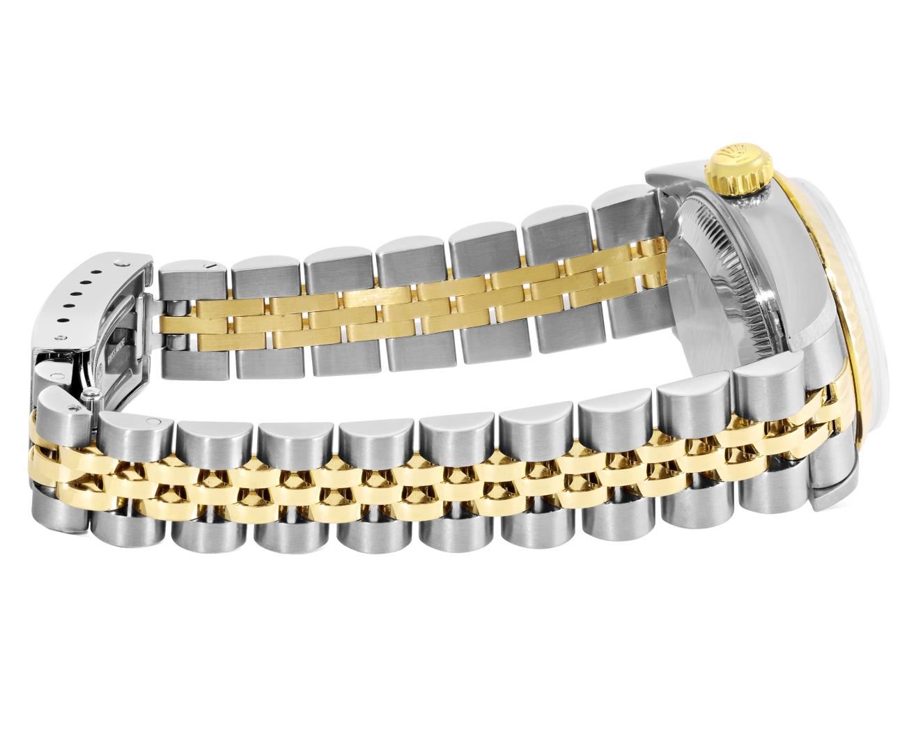 Rolex Ladies Pre Owned Sapphire Quickset 18K Yellow Gold and Stainless Steel Two Tone Datejust Polished Bright with Satin Finish, Serviced & Electronically Tested, Rolex Stainless Steel Case: 26mm, Rolex 18K Yellow Gold Crown, Rolex 18K Yellow Gold Fluted Bezel. Crystal: Sapphire With Magnified Date Window. Hands: Luminescent Hands. Rolex Movement: Automatic Winding Movement 2235. Rolex Dial: Factory Black Index Dial. Date Window: 3 O'clock Position Date Display, Model: Quickset Datejust, Condition: G-6 Extra Fine. Rolex Bracelet: 18K Yellow Gold & Stainless Steel Jubilee Band. Bright Polish & Satin Finish. 6.0 Inch Length, Adjustable. Standard Clasp, With Rolex Logo. This Watch Has Been Serviced Time Tested And Is In Excellent Condition It Is Free Of All Scratches And Dents. This Watch Comes With A Rolex Box.
