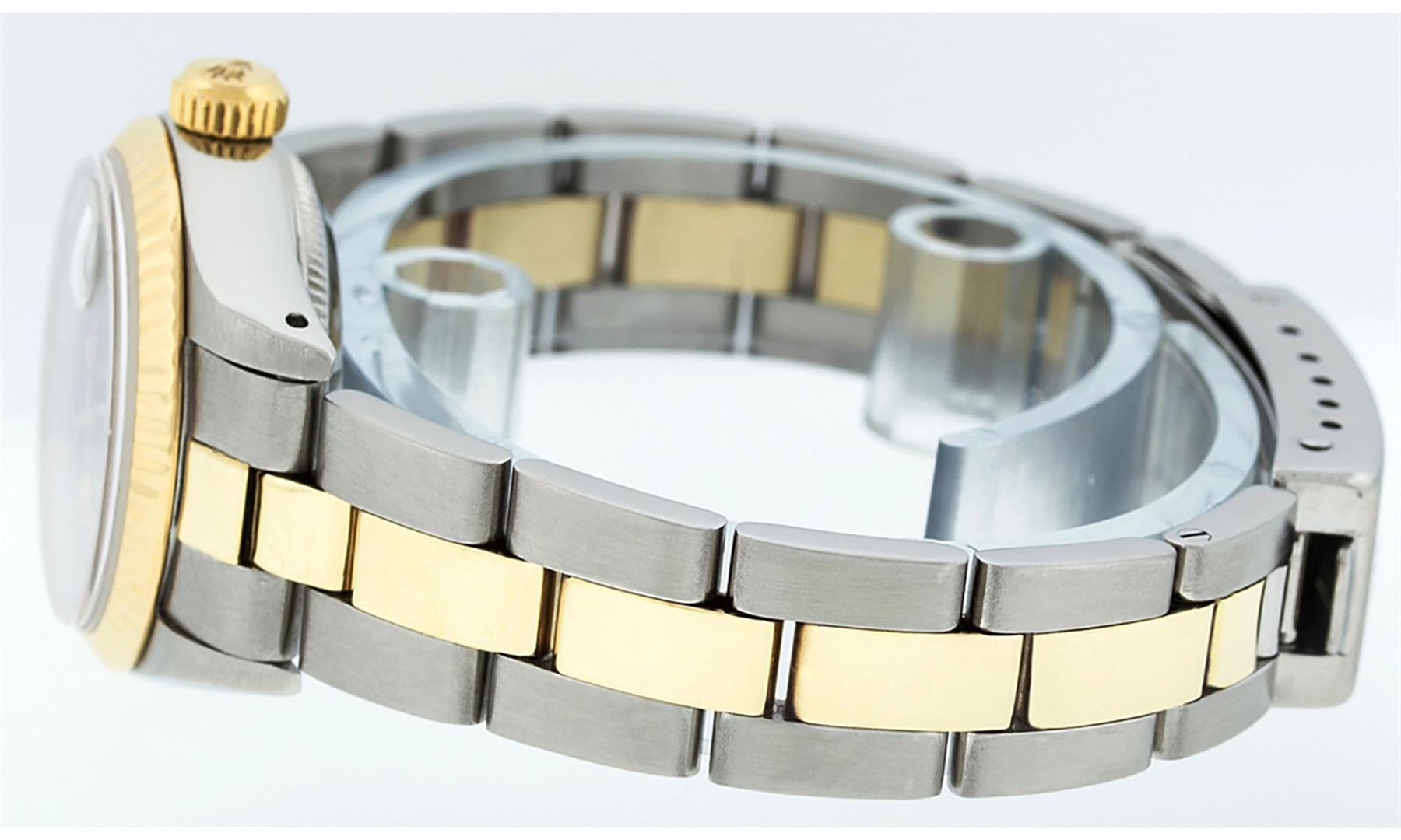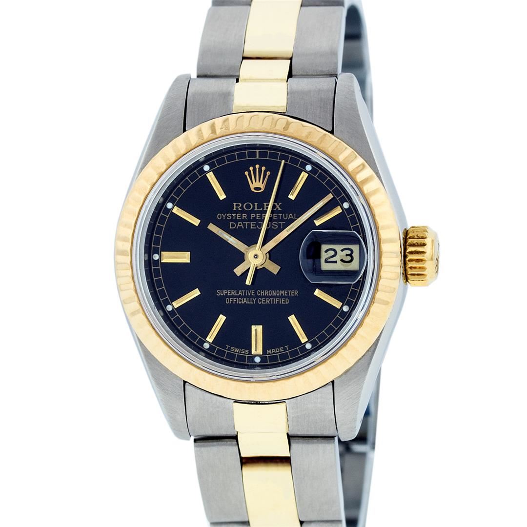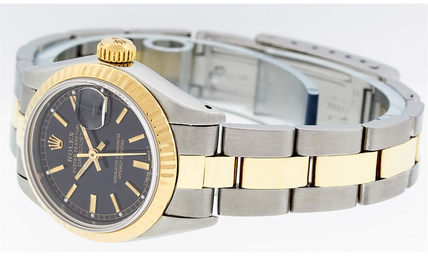 One Ladies Two Tone Rolex Datejust Polished, Serviced & Electronically Tested, Yellow Gold & Stainless Steel Case: 26mm, Yellow Gold Crown, Bezel: Yellow Gold Fluted Bezel. Custom Crystal: New Acrylic Cyclops Lens. Custom Hands: Custom Luminescent Hands.