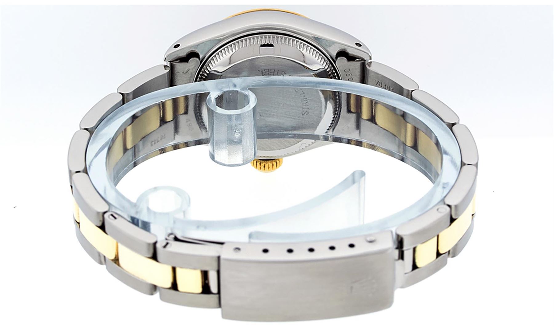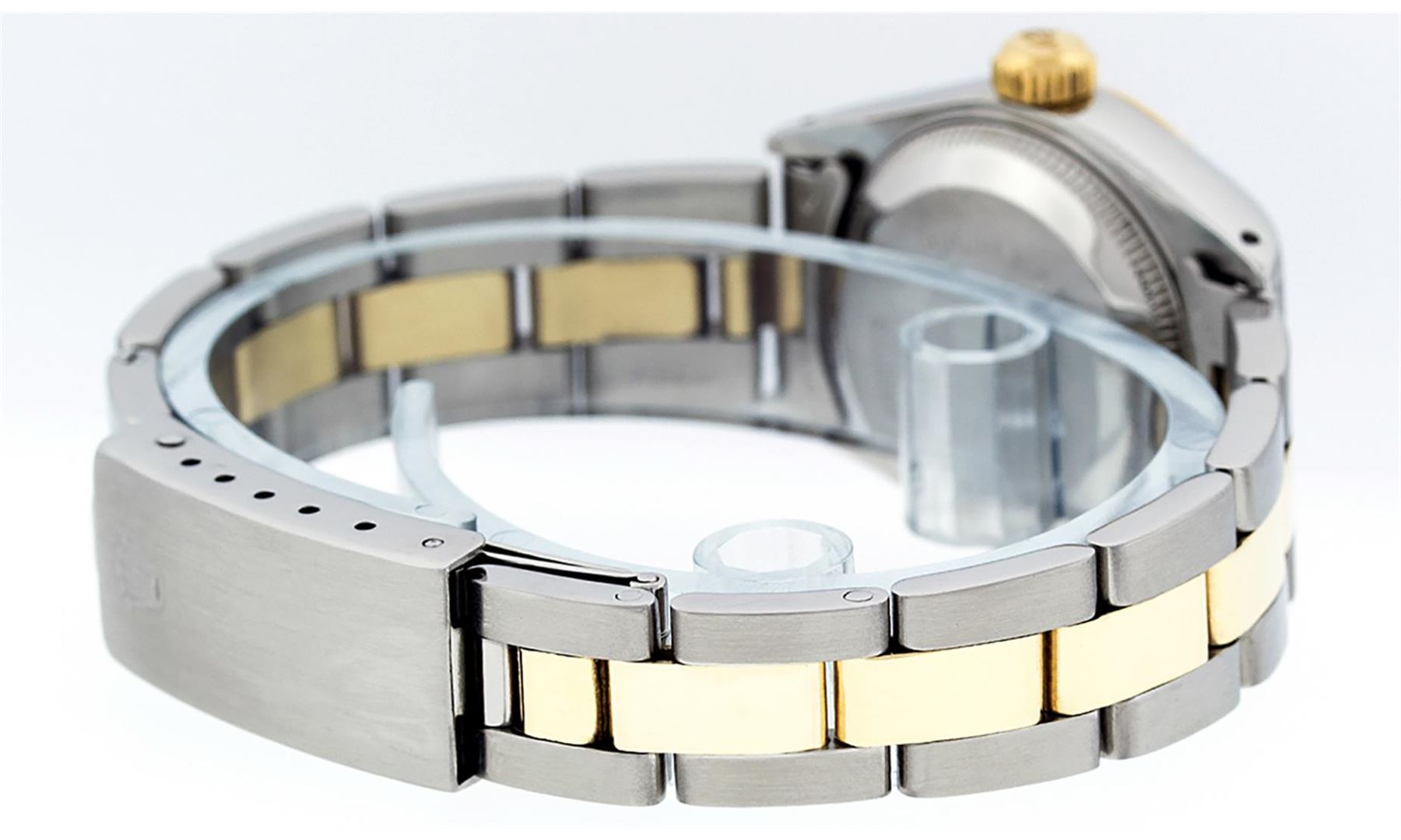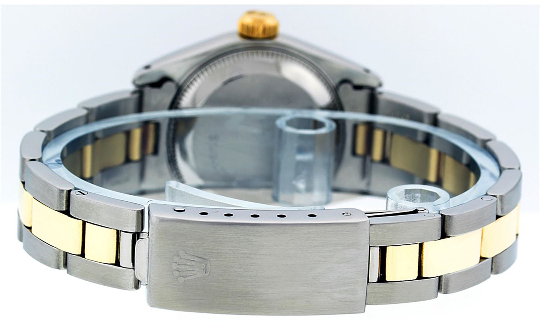 One Ladies Two Tone Rolex Datejust Polished, Serviced & Electronically Tested, Yellow Gold & Stainless Steel Case: 26mm, Yellow Gold Crown, Bezel: Yellow Gold Fluted Bezel. Custom Crystal: New Acrylic Cyclops Lens. Custom Hands: Custom Luminescent Hands.