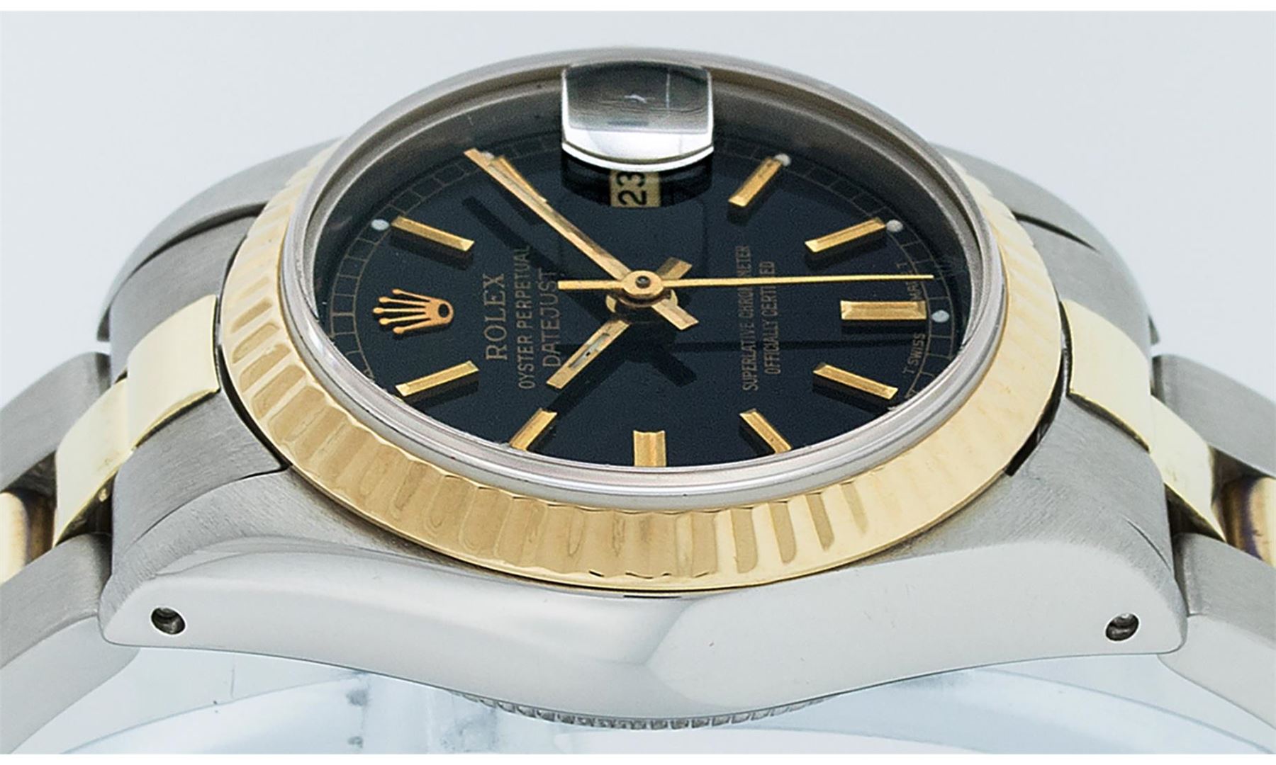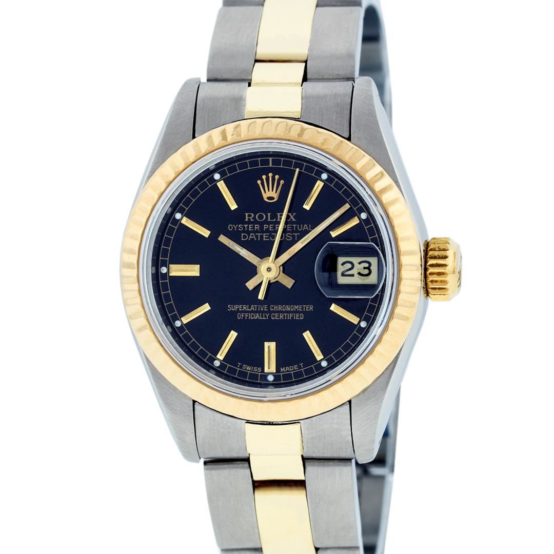 One Ladies Pre Two Tone 14K Yellow Gold & Stainless Steel Rolex Polished, Serviced & Electronically Tested, 14K Yellow Gold & Stainless Steel Case: 26mm, Yellow Gold Crown, Bezel: 14K Yellow Gold Fluted Bezel. Custom Crystal: New Plexiglass With Date Window. Hands: Luminescent Hands. Rolex Movement: Automatic Winding Movement 2030. Custom Dial: Black Index With Dash Track & Lumi Dots. Date Window: 3 O'Clock Position Date Display, Model: Datejust. Condition: G-6 Extra Fine. Bracelet: Two Tone 14K Yellow Gold & Stainless Steel Oyster Band. Bright Polish. 6.0 Inch Length, Adjustable. Standard Clasp, With Rolex Logo. This Watch Has Been Serviced Time Tested And Is In Excellent Condition It Is Free Of All Scratches And Dents.