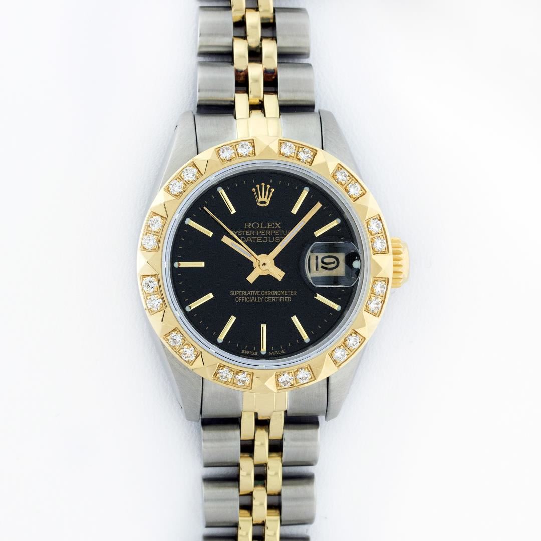 One Ladies Pre Owned Rolex Two Tone 14K Yellow Gold & Stainless Steel Rolex Polished, Serviced & Electronically Tested, Rolex 14K Yellow Gold & Stainless Steel Case: 26mm, Rolex Yellow Gold Crown, Custom Bezel: New 18K Yellow Gold Pyramid Diamond Bezel, Diamond Count: 24 Diamonds In Bezel. Total Weight .50 Carat, Clarity: SI-VS, Color: G to H. Custom Crystal: New Sapphire With Magnified Date Window. Custom Hands: New Luminescent Hands. Rolex Movement: Automatic Winding Movement 2030. Rolex Dial: Black With Index Hour Markers With Dash Track & Lumi Dots. Date Window: 3 O'Clock Position Date Display, Model: Date. Condition: G-6 Extra Fine. Rolex Bracelet: Two Tone 14K Yellow Gold & Stainless Steel Jubilee Band. Bright Polish. 6.0 Inch Length, Adjustable. Standard Clasp, With Rolex Logo. This Watch Has Been Serviced Time Tested And Is In Excellent Condition It Is Free Of All Scratches And Dents.