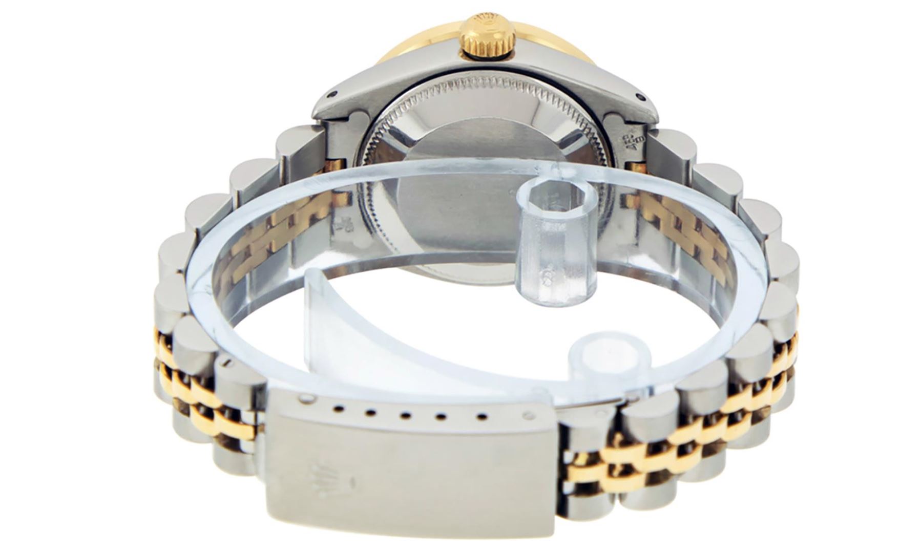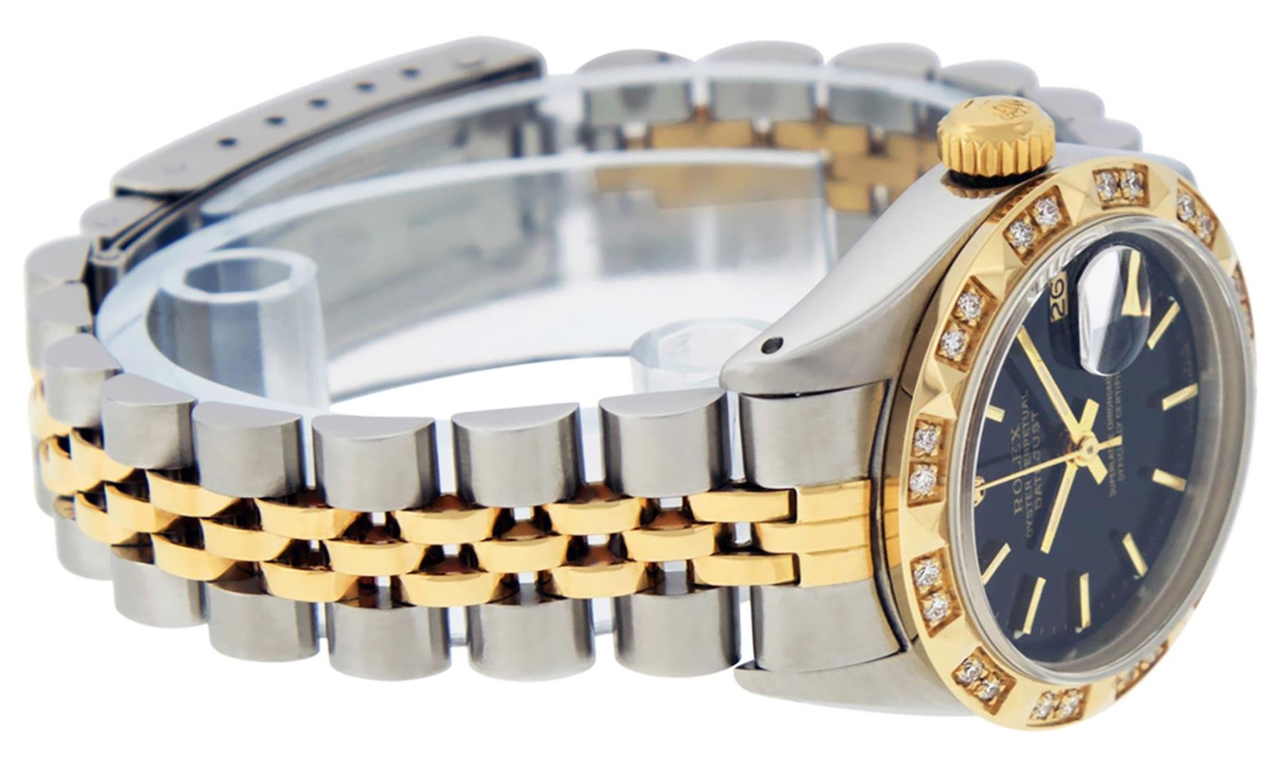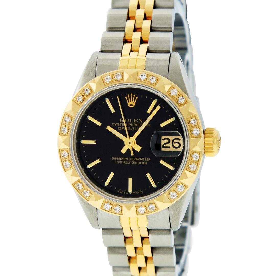 One Ladies Pre Owned Rolex Two Tone 14K Yellow Gold & Stainless Steel Rolex Polished, Serviced & Electronically Tested, Rolex 14K Yellow Gold & Stainless Steel Case: 26mm, Rolex Yellow Gold Crown, Custom Bezel: New 18K Yellow Gold Pyramid Diamond Bezel, Diamond Count: 24 Diamonds In Bezel. Total Weight .50 Carat, Clarity: SI-VS, Color: G to H. Custom Crystal: New Sapphire With Magnified Date Window. Custom Hands: New Luminescent Hands. Rolex Movement: Automatic Winding Movement 2030. Rolex Dial: Black With Index Hour Markers With Dash Track & Lumi Dots. Date Window: 3 O'Clock Position Date Display, Model: Date. Condition: G-6 Extra Fine. Rolex Bracelet: Two Tone 14K Yellow Gold & Stainless Steel Jubilee Band. Bright Polish. 6.0 Inch Length, Adjustable. Standard Clasp, With Rolex Logo. This Watch Has Been Serviced Time Tested And Is In Excellent Condition It Is Free Of All Scratches And Dents.