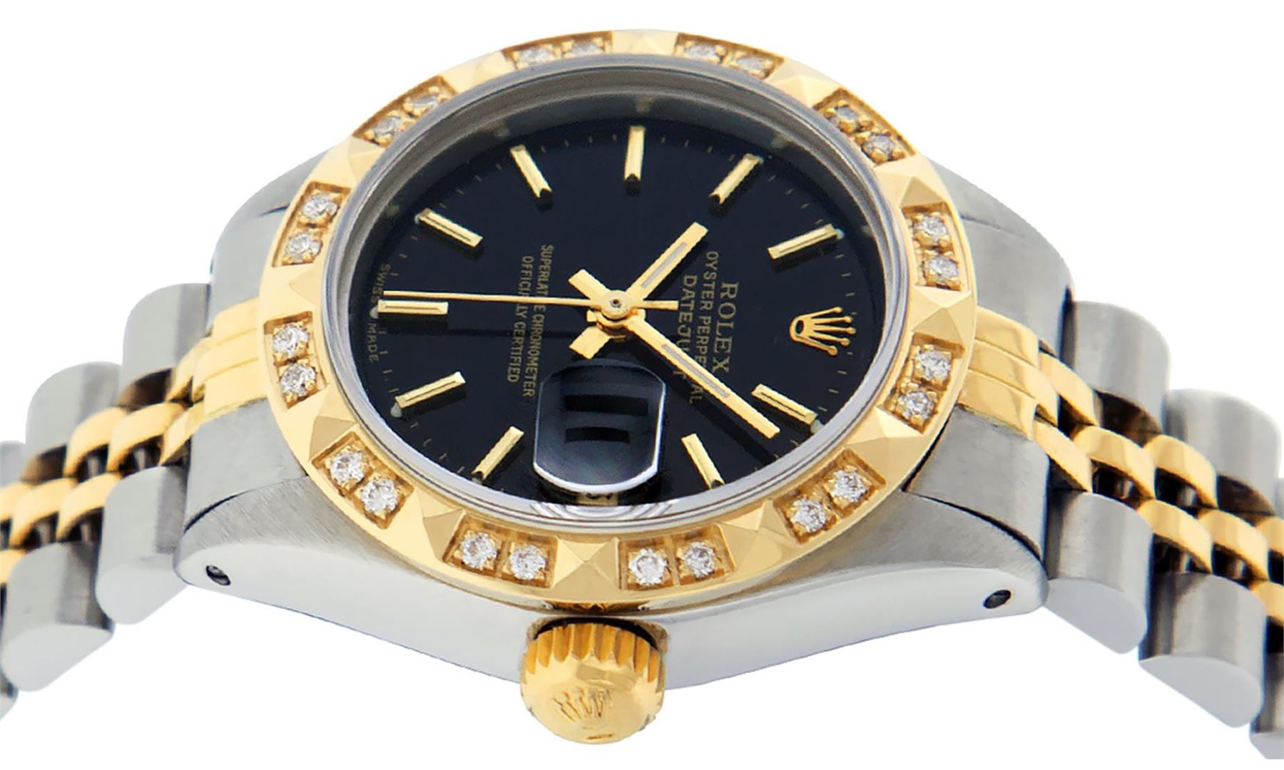 One Ladies Quickset Pre Owned Rolex Two Tone 18K Yellow Gold And Stainless Steel Rolex Polished, Serviced And Electronically Tested, Rolex 18K Yellow Gold And Stainless Steel Case: 26mm, Rolex Yellow Gold Crown, Custom Bezel: New 18K Yellow Gold Pyramid Diamond Bezel, Diamond Count: 24 Diamonds In Bezel. Custom Crystal: New Sapphire With Magnified Date Window. Custom Hands: New Luminescent Hands. Rolex Movement: Automatic Winding Movement 2135. Rolex Dial: Black With Index Hour Markers With Dash Track & Lumi Dots. Date Window: 3 O'Clock Position Date Display, Model: Quickset Datejust. Condition: G-6 Extra Fine. Rolex Bracelet: Two Tone 18K Yellow Gold And Stainless Steel Jubilee Band. Bright Polish. 6.0 Inch Length, Adjustable. Standard Clasp, With Rolex Logo. This Watch Has Been Serviced Time Tested And Is In Excellent Condition It Is Free Of All Scratches And Dents.