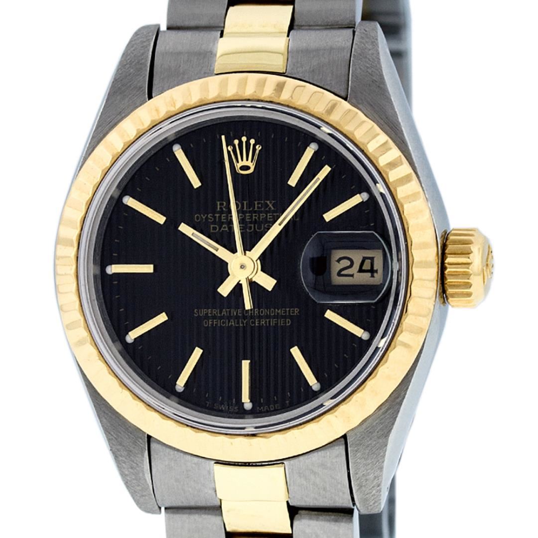 One Ladies Pre Owned Two Tone 14K Yellow Gold And Stainless Steel Rolex Polished, Serviced & Electronically Tested, Rolex Yellow Gold & Stainless Steel Case: 26mm, Yellow Gold Crown, Rolex Bezel: 14K Yellow Gold Fluted Bezel. Crystal: Plexiglass With Magnified Date Window. Hands: Luminescent Hands. Rolex Movement: Automatic Winding Movement 2030. Rolex Dial: Black Tapestry With Index Hour Markers. Date Window: 3 O'Clock Position Date Display, Model: Date. Condition: G-6 Extra Fine. Rolex Bracelet: Two Tone 14K Yellow Gold & Stainless Steel Oyster Band. Bright Polish. 6.0 Inch Length, Adjustable. Standard Clasp, With Rolex Logo. This Watch Has Been Serviced Time Tested And Is In Excellent Condition It Is Free Of All Scratches And Dents.