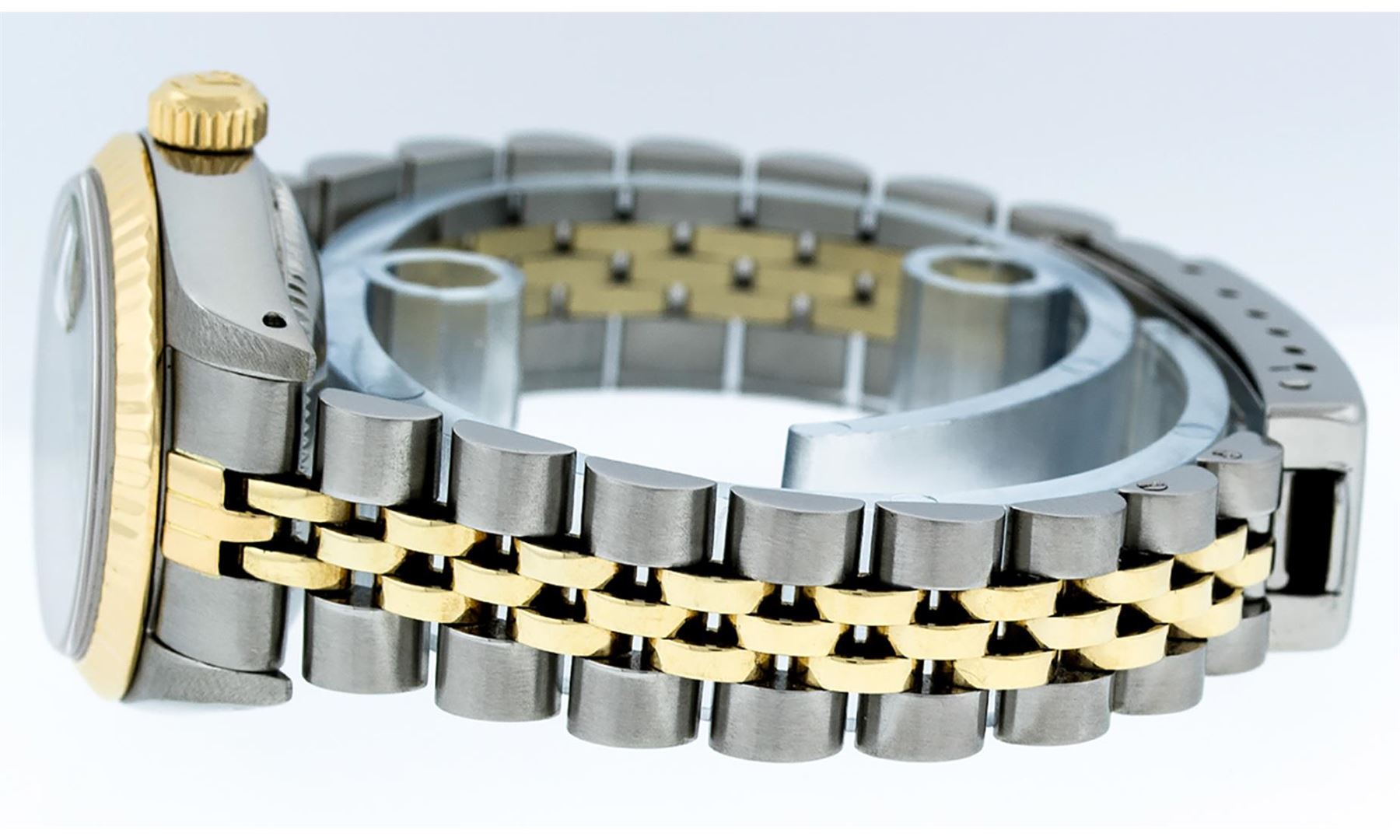 One Ladies Pre Owned Two Tone 14K Yellow Gold & Stainless Steel Rolex Polished, Serviced & Electronically Tested, Rolex Yellow Gold & Stainless Steel Case: 26mm, Rolex Yellow Gold Crown, Rolex Bezel: 14K Yellow Gold Fluted Bezel. Custom Crystal: New Plexiglass With Magnified Date Window. Custom Hands: New Luminescent Hands. Rolex Movement: Automatic Winding Movement 2030. Rolex Dial: Black Tapestry With Index Hour Markers. Date Window: 3 O'Clock Position Date Display, Model: Datejust. Condition: G-6 Extra Fine. Rolex Bracelet: Two Tone 14K Yellow Gold & Stainless Steel Jubilee Band. Bright Polish. 6.0 Inch Length, Adjustable. Standard Clasp, With Rolex Logo. This Watch Has Been Serviced Time Tested And Is In Excellent Condition It Is Free Of All Scratches And Dents.
