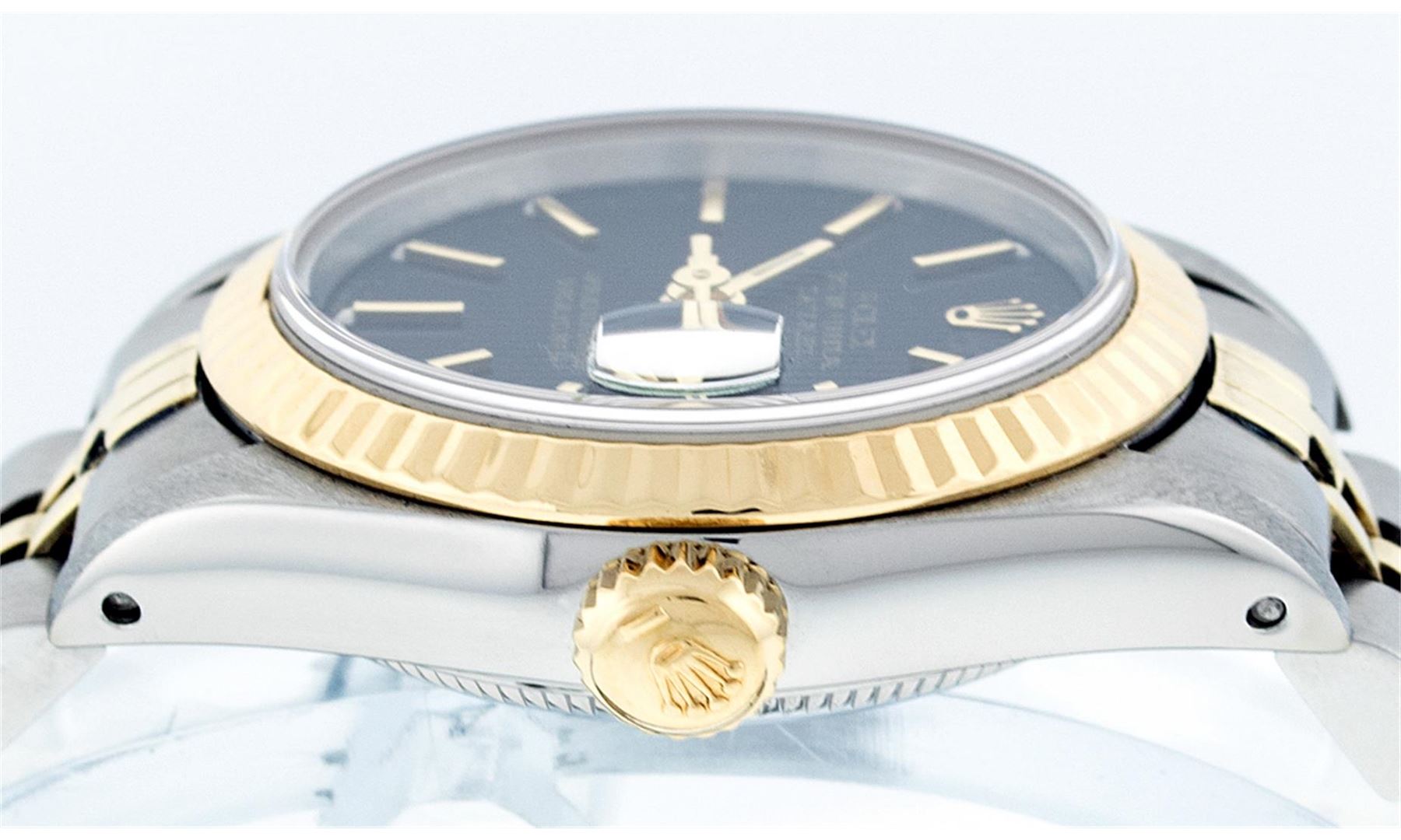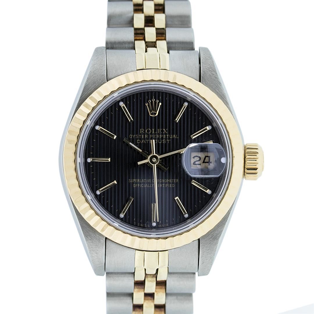 One Ladies Pre Owned Two Tone Rolex Datejust Polished, Serviced & Electronically Tested, Rolex Yellow Gold & Stainless Steel Case: 26mm, Rolex Yellow Gold Crown, Rolex Bezel: Yellow Gold Fluted Bezel. Custom Crystal: New Acrylic Cyclops Lens. Hands: Luminescent Hands. Rolex Movement: Automatic Winding Movement. Dial: Black Tapestry With Index Hour Markers. Date Window: 3 O'Clock Position Date Display, Model: Datejust. Condition: G-6 Extra Fine. Rolex Bracelet: Two Tone Yellow Gold & Stainless Steel Jubilee Band. Bright Polish. 6.0 Inch Length, Adjustable. Standard Clasp, With Rolex Logo. This Watch Has Been Serviced Time Tested And Is In Excellent Condition It Is Free Of All Scratches And Dents.