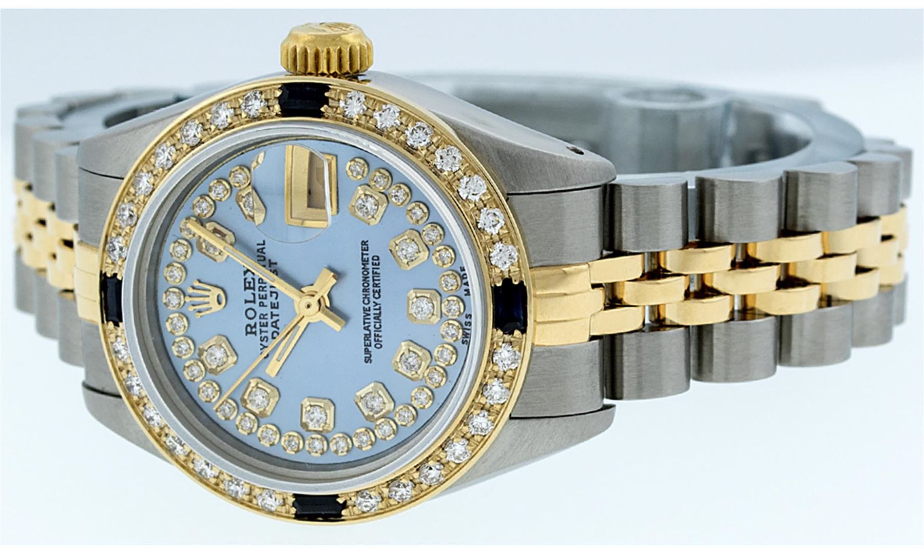 One Ladies 14K Two Tone Rolex Datejust Polished, Serviced & Electronically Tested, 14K Yellow Gold & Stainless Steel Case: 26mm, 14K Yellow Gold Crown, Custom Bezel: 18K Yellow Gold Sapphire Beadset Diamond Bezel, Diamond Count: 28 Diamonds + 4 Sapphires. Total Weight .70 Carat, Clarity: Si-VS, Color: G to H. Custom Crystal: New Synthetic Sapphire Cyclops Lens. Custom Hands: New Luminescent Hands. Movement: Automatic Winding Movement Caliber 2030. Custom Dial: Blue Mother Of Pearl With String Diamond Hour Markers. Diamond Count: 43 Diamonds In Dial, Clarity: Si-VS, Color: G to H. Date Window: 3 O'Clock Position Date Display, Non Quickset, Model: Datejust. Condition: G-6 Extra Fine. Bracelet: Two Tone 14K Yellow Gold & Stainless Steel Jubilee. Bright Polish. 6.0 Inch Length, Adjustable. Standard Clasp, With Rolex Logo.