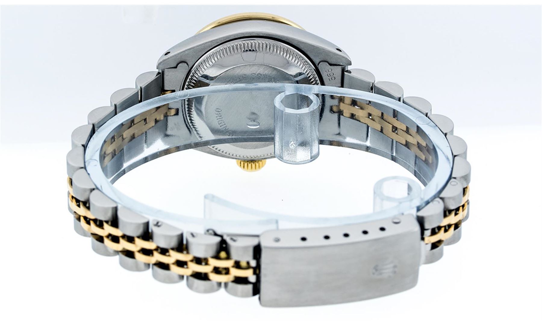 One Ladies 14K Two Tone Rolex Datejust Polished, Serviced & Electronically Tested, 14K Yellow Gold & Stainless Steel Case: 26mm, 14K Yellow Gold Crown, Custom Bezel: 18K Yellow Gold Sapphire Beadset Diamond Bezel, Diamond Count: 28 Diamonds + 4 Sapphires. Total Weight .70 Carat, Clarity: Si-VS, Color: G to H. Custom Crystal: New Synthetic Sapphire Cyclops Lens. Custom Hands: New Luminescent Hands. Movement: Automatic Winding Movement Caliber 2030. Custom Dial: Blue Mother Of Pearl With String Diamond Hour Markers. Diamond Count: 43 Diamonds In Dial, Clarity: Si-VS, Color: G to H. Date Window: 3 O'Clock Position Date Display, Non Quickset, Model: Datejust. Condition: G-6 Extra Fine. Bracelet: Two Tone 14K Yellow Gold & Stainless Steel Jubilee. Bright Polish. 6.0 Inch Length, Adjustable. Standard Clasp, With Rolex Logo.