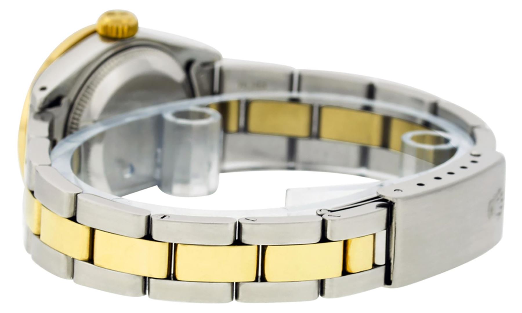 One Ladies Pre Owned Quickset Two Tone Yellow Gold And Stainless Steel Rolex Datejust Polished, Serviced And Electronically Tested, Yellow Gold And Stainless Steel Case: 26mm, Yellow Gold Crown, Custom Bezel: New 18K 1ctw Yellow Gold Beadset Diamond Bezel, Diamond Count: 42 Diamonds On Dial, Total Weight 1.00 Carat. Custom Crystal: New Sapphire With Magnified Date Window. Custom Hands: New Luminescent Hands. Rolex Movement: Automatic Winding Movement 2135. Custom Dial: Blue Vignette Dial With Added Diamonds , Diamond Count: 10 Single Cut Diamonds On Dial. Date Window: 3 O'Clock Position Date Display, Model: Datejust, Condition: G-6 Extra Fine. Rolex Bracelet: Two Tone Yellow Gold And Stainless Steel Oyster Band. Bright Polish. 6.0 Inch Length, Adjustable. Standard Clasp, With Rolex Logo. This Watch Has Been Serviced Time Tested And Is In Excellent Condition It Is Free Of All Scratches And Dents.