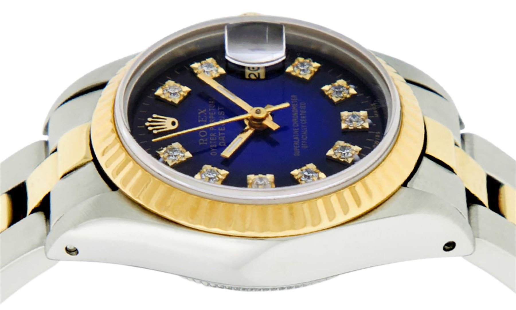 One Ladies Two Tone Rolex Datejust Polished, Serviced & Electronically Tested, Yellow Gold & Stainless Steel Case: 26mm, Yellow Gold Crown, Bezel: Yellow Gold Fluted Bezel. Custom Crystal: New Acrylic Cyclops Lens. Custom Hands: New Luminescent Hands. Movement: Automatic Winding Movement. Custom Dial: Blue Vignette With Diamond Hour Markers, Diamond Count: 10 Single Cut Diamonds, Color: G to H, Clarity: VS. Date Window: 3 O'clock Position Date Display, Model: Datejust. Condition: G-6 Extra Fine. Bracelet: Two Tone Yellow Gold & Stainless Steel Jubilee. Bright Polish. 6.0 Inch Length, Adjustable. Standard Clasp, With Rolex Logo. This Watch Has Been Serviced Time Tested And Is In Excellent Condition It Is Free Of All Scratches And Dents.