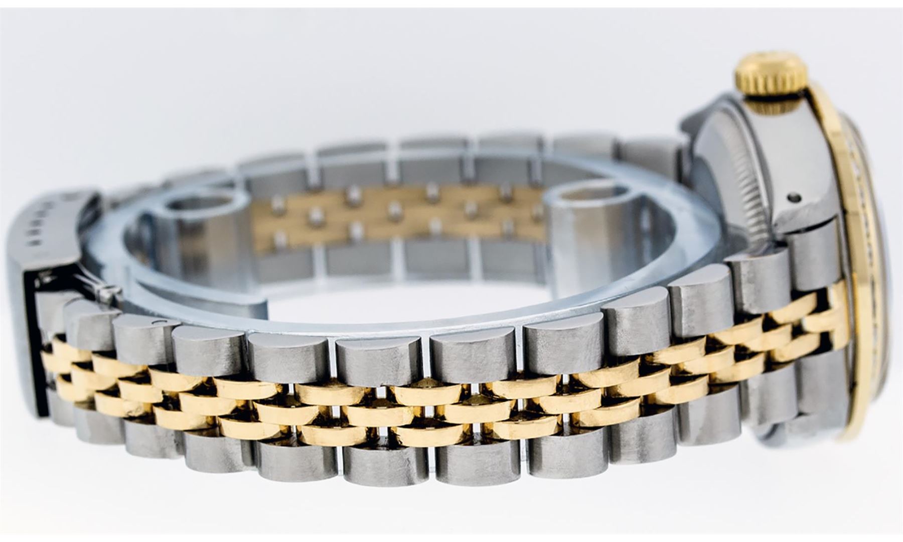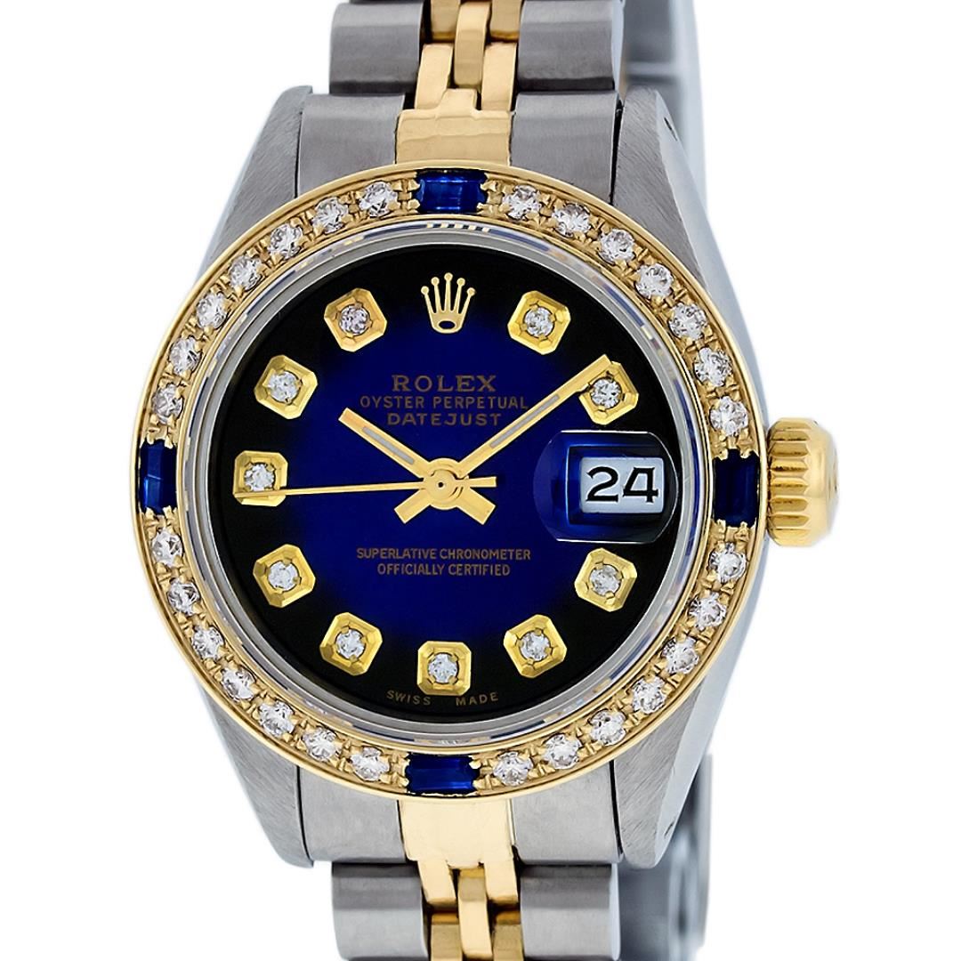 One Ladies Pre Owned Rolex Quickset Two Tone 18K Yellow Gold And Stainless Steel Datejust Polished, Serviced & Electronically Tested, Rolex Yellow Gold & Stainless Steel Case: 26mm, Rolex Yellow Gold Crown, Custom Bezel: New 18K Yellow Gold Sapphire Beadset Diamond Bezel, Diamond + Gem Count: 28 Diamonds + 4 Sapphires. Custom Crystal: New Sapphire With Magnified Date. Custom Hands: New Luminescent Hands. Rolex Movement: Automatic Winding Movement 2135. Custom Dial: Custom Blue Vignette Dial Set With Added Diamond Hour Markers, Diamond Count: 10 Diamond in Dial. Date Window: 3 O'Clock Position Date Display, Model: Quickset Datejust, Condition: G-6 Extra Fine. Rolex Bracelet: Two Tone Yellow Gold & Stainless Steel Jubilee Band. Bright Polish. 6.0 Inch Length, Adjustable. Standard Clasp, With Rolex Logo. This Watch Has Been Serviced Time Tested And Is In Excellent Condition It Is Free Of All Scratches And Dents.