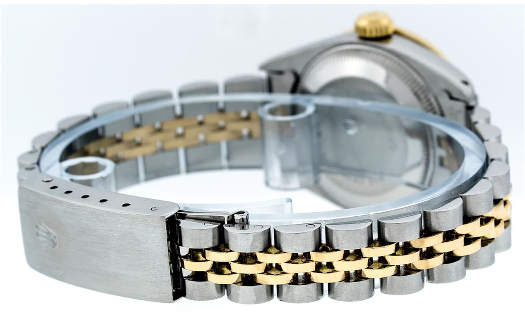 One Ladies 14K Two Tone Rolex Datejust Polished, Serviced & Electronically Tested, 14K Yellow Gold & Stainless Steel Case: 26mm, 14K Yellow Gold Crown, Custom Bezel: New 18K Yellow Gold Sapphire Beadset Diamond Bezel, Diamond + Gem Count: 28 Diamonds + 4 Sapphires Total Weight .70 Carat, Clarity: Si-VS, Color: G to H. Custom Crystal: New Synthetic Sapphire Cyclops Lens. Custom Hands: New Luminescent Hands. Movement: Automatic Winding Movement Caliber 2030. Custom Dial: Blue Vignette Dial Set With Diamond Hour Markers, Diamond Count: 10 Diamond in Dial, G To H In Color, SI-VS Clarity. Date Window: 3 O'Clock Position Date Display, Model: Datejust, Condition: G-6 Extra Fine. Bracelet: Two Tone 14K Yellow Gold & Stainless Steel Jubilee. Bright Polish. 6.0 Inch Length, Adjustable. Standard Clasp, With Rolex Logo. This Watch Has Been Serviced Time Tested And Is In Excellent Condition It Is Free Of All Scratches And Dents.