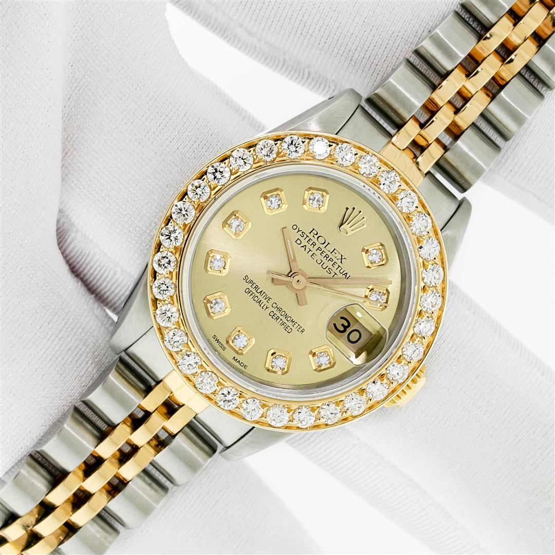 One Ladies Yellow Gold and Stainless Steel Two Tone Rolex Datejust Polished Bright with Satin Finish, Serviced & Electronically Tested, Rolex Stainless Steel Case: 26mm, Rolex Yellow Gold Crown, Custom Bezel: New 18K Yellow Gold Beadset Diamond Bezel, Total Weight 2.0 Carat, Clarity: VS, Custom Crystal: New Sapphire With Magnified Date. Custom Hands: New luminous hands. Rolex Movement: Automatic Winding Movement. Custom Dial: Refinished Champagne With Custom Added Diamonds, Diamond Count: 10 Diamonds In Dial, Date Window: 3 O'clock Position Date Display, Model: Datejust, Condition: G-6 Extra Fine. Rolex Bracelet: Stainless Steel and Yellow Gold Jubilee Band. Bright Polish & Satin Finish. 6.00 Inch Length, Adjustable. Standard Clasp, With Rolex Logo. This Pre Owned Watch Has Been Serviced Time Tested And Is In Excellent Condition It Is Free Of All Scratches And Dents. This Rolex Complete Set Comes With The Following Accessories: Rolex Box, Rolex Booklets, Rolex Hang Tag, Rolex Wallet and Polishing Cloth.