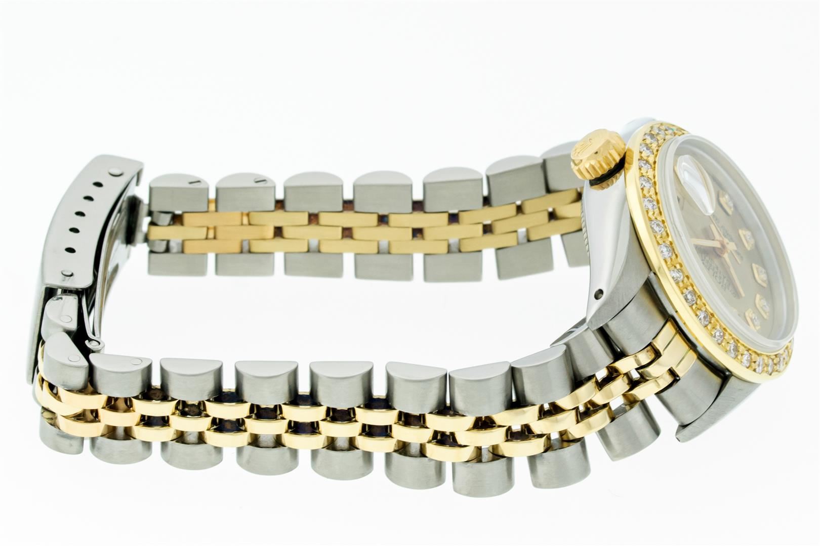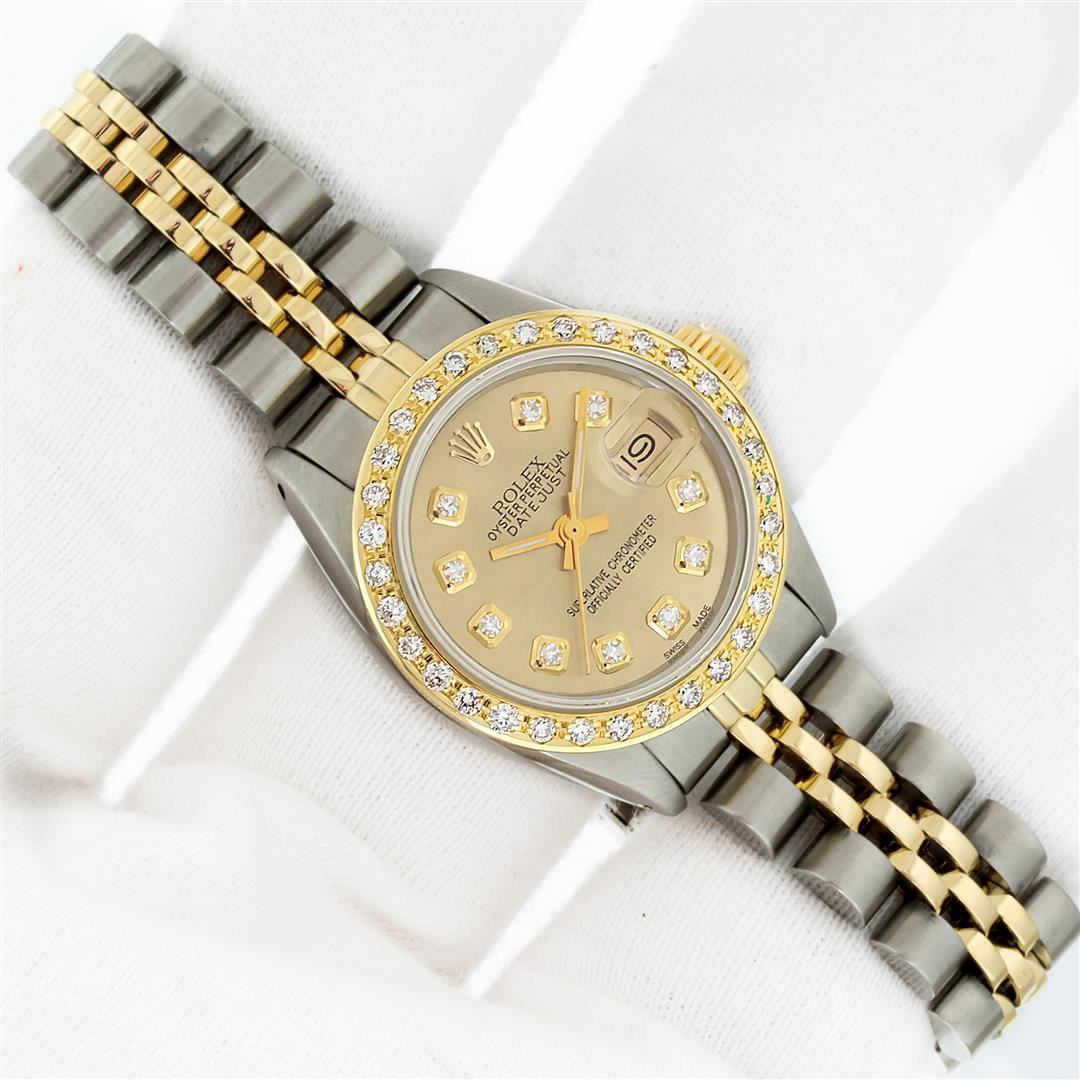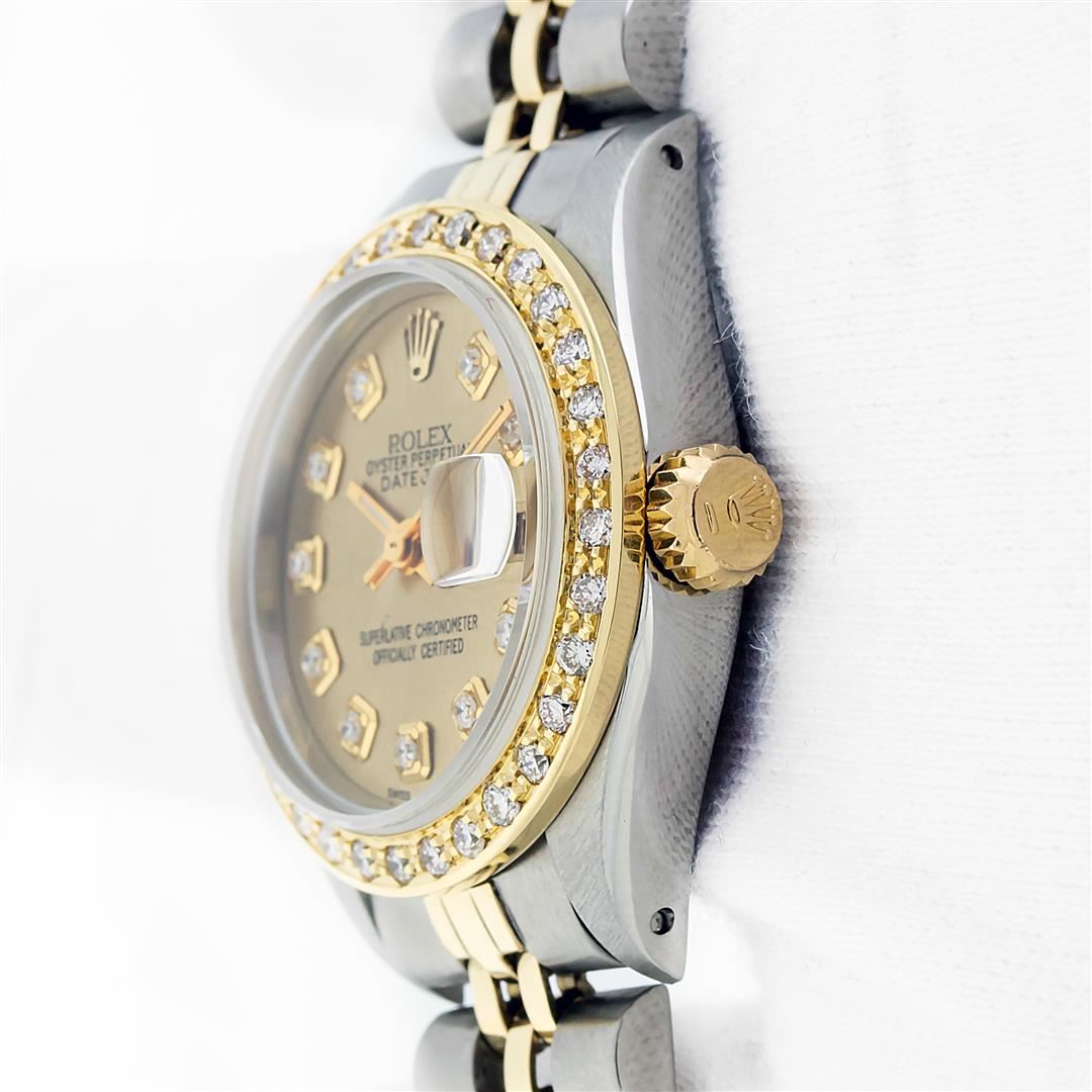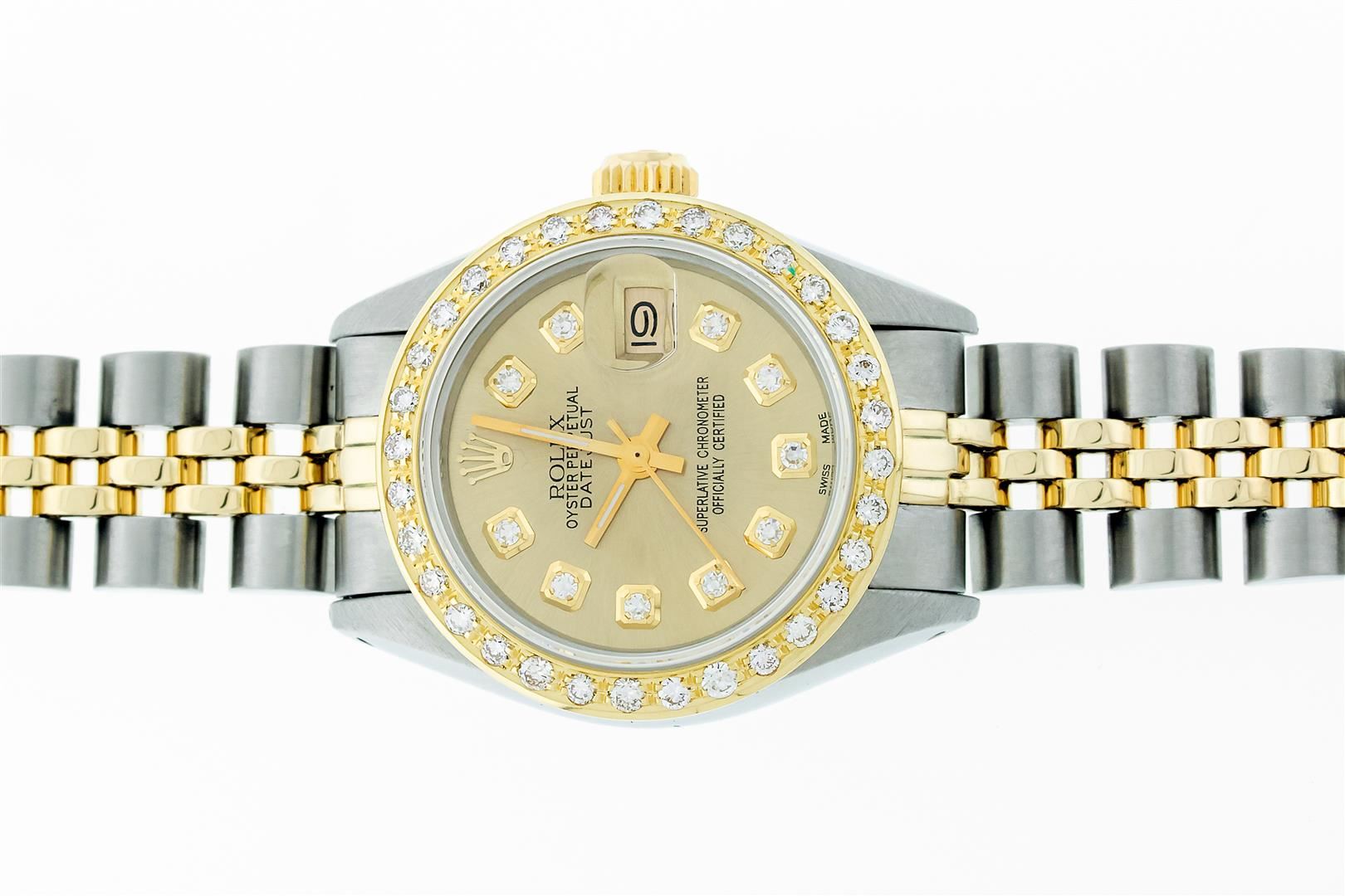 One Ladies Two Tone Rolex Datejust Polished, Serviced & Electronically Tested, Rolex Yellow Gold & Stainless Steel Case: 26mm, Rolex Yellow Gold Crown, Custom Bezel: New 18K Yellow Gold Beadset Diamond Bezel, Diamond Count: 32 Diamonds, Total Weight .70 Carat, Clarity: Si-VS, Color: G to H. Custom Crystal: New Sapphire With Magnified Date Window. Custom Hands: New Gold Hands. Rolex Movement: Automatic Winding Movement. Custom Dial: Refinished To Champagne With Added Diamonds, Diamond Count: 10 Single Cut Diamonds in Dial, G To H In Color, VS Clarity. Date Window: 3 O'clock Position Date Display, Model: Datejust, Condition: G-6 Extra Fine. Rolex Bracelet: Two Tone Yellow Gold & Stainless Steel Jubilee Band. Bright Polish. 6.0 Inch Length, Adjustable. Standard Clasp, With Rolex Logo. This Pre Owned Watch Has Been Serviced Time Tested And Is In Excellent Condition It Is Free Of All Scratches And Dents.