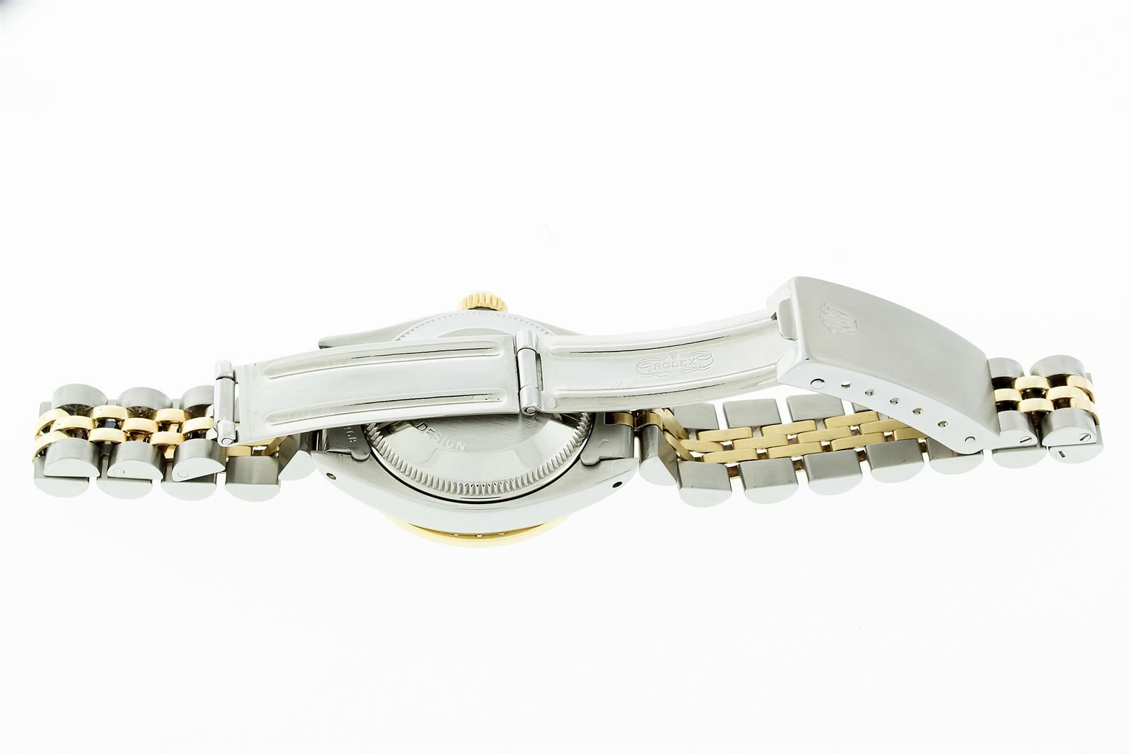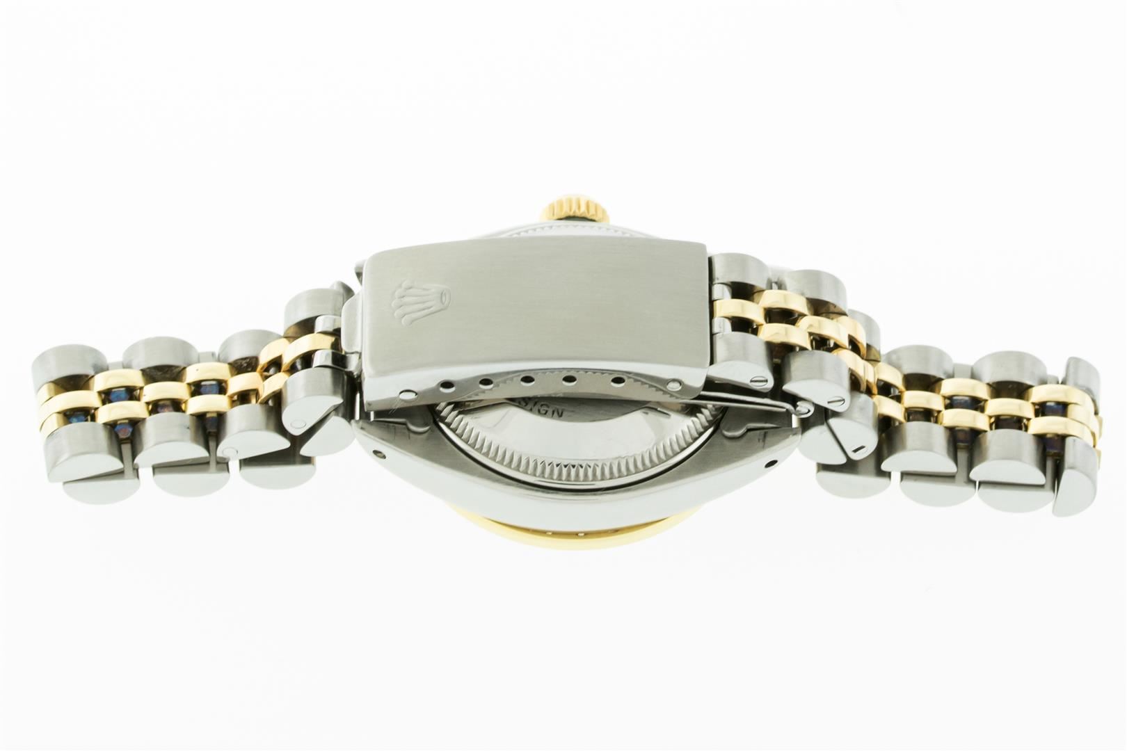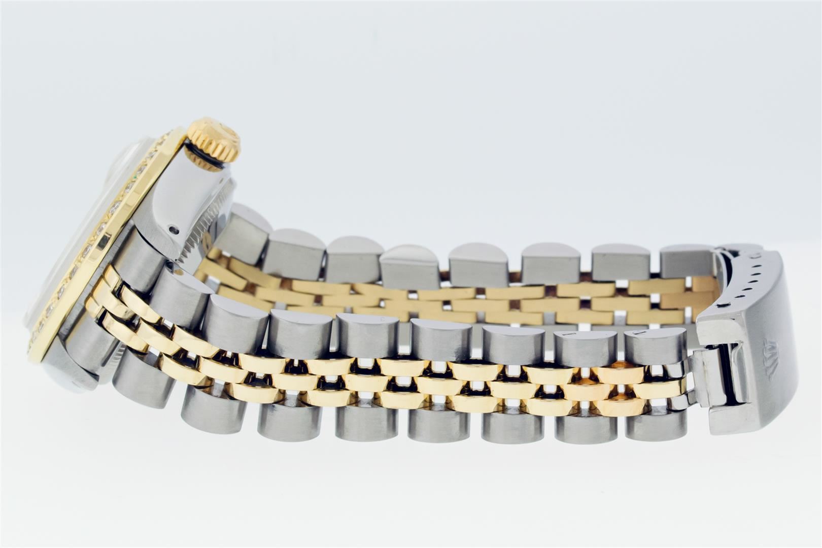 One Ladies Two Tone Rolex Datejust Polished, Serviced & Electronically Tested, Rolex Yellow Gold & Stainless Steel Case: 26mm, Rolex Yellow Gold Crown, Custom Bezel: New 18K Yellow Gold Beadset Diamond Bezel, Diamond Count: 32 Diamonds, Total Weight .70 Carat, Clarity: Si-VS, Color: G to H. Custom Crystal: New Sapphire With Magnified Date Window. Custom Hands: New Gold Hands. Rolex Movement: Automatic Winding Movement. Custom Dial: Refinished To Champagne With Added Diamonds, Diamond Count: 10 Single Cut Diamonds in Dial, G To H In Color, VS Clarity. Date Window: 3 O'clock Position Date Display, Model: Datejust, Condition: G-6 Extra Fine. Rolex Bracelet: Two Tone Yellow Gold & Stainless Steel Jubilee Band. Bright Polish. 6.0 Inch Length, Adjustable. Standard Clasp, With Rolex Logo. This Pre Owned Watch Has Been Serviced Time Tested And Is In Excellent Condition It Is Free Of All Scratches And Dents.