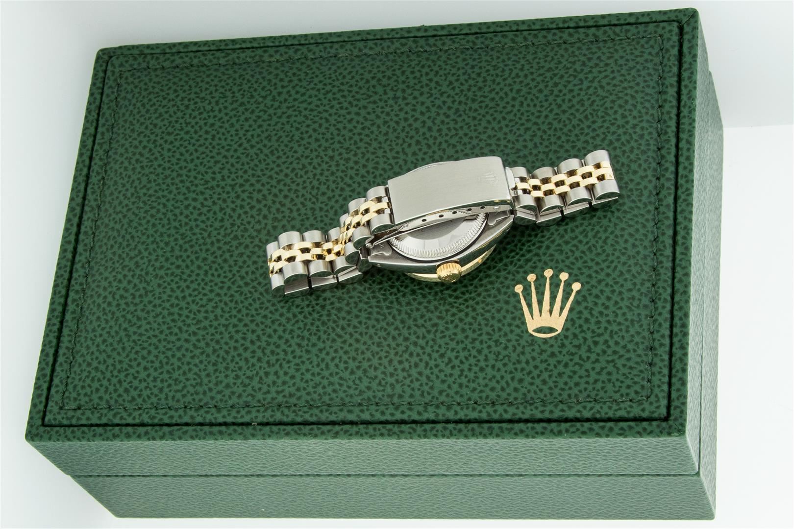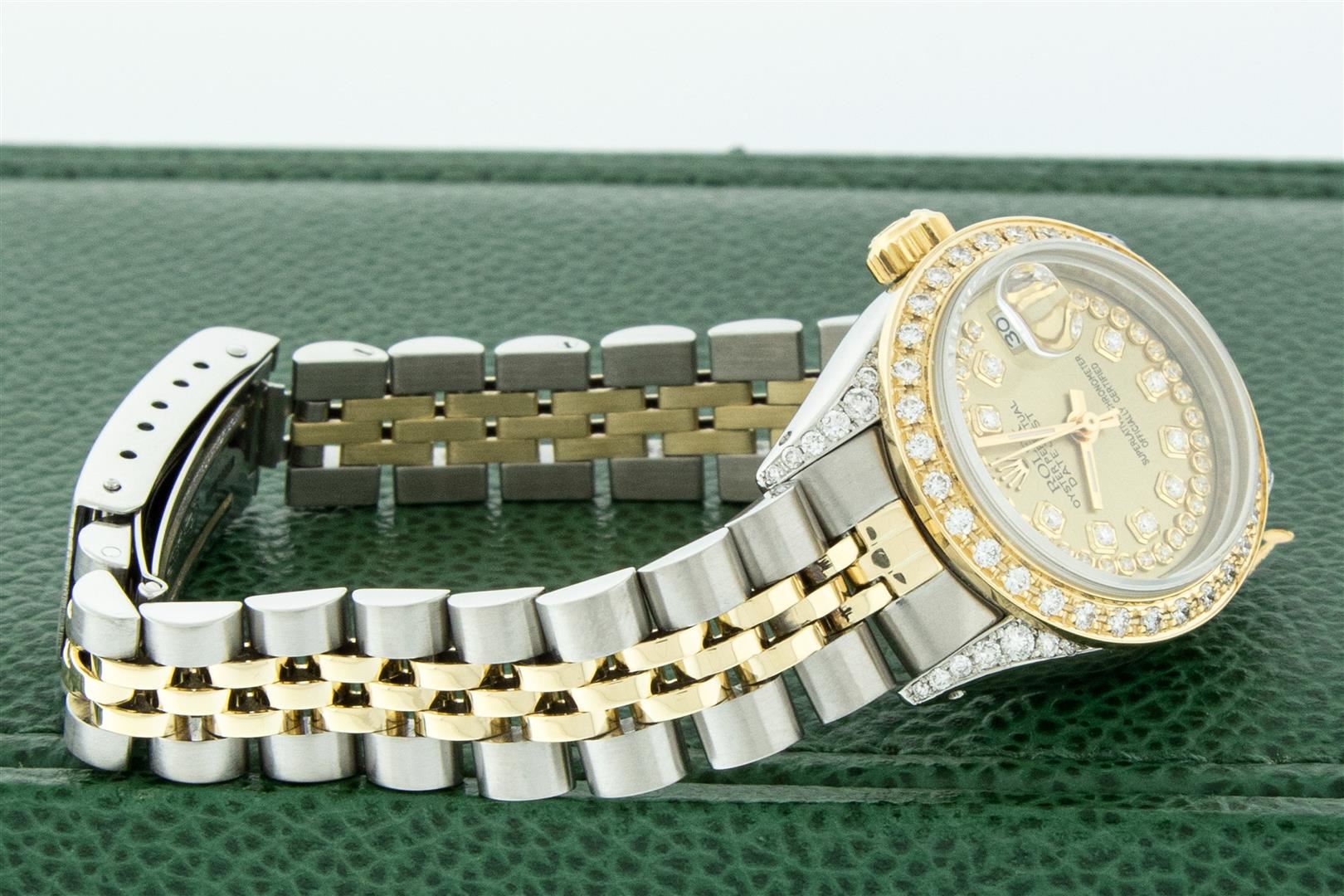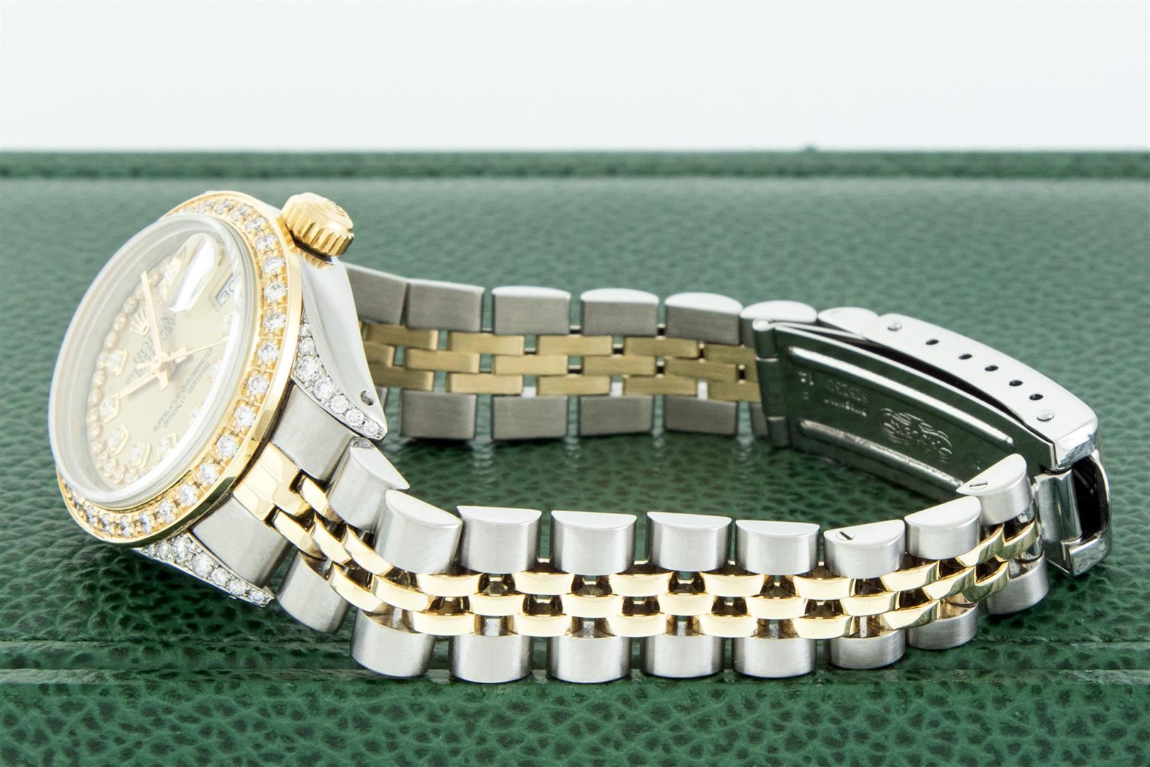 One Ladies Two Tone Rolex Datejust Polished, Serviced & Electronically Tested, Rolex Yellow Gold & Stainless Steel Case: 26mm, Rolex Yellow Gold Crown, Custom Diamond Lugs: 24 Diamonds On Lugs, Clarity: SI-VS, Color: G to H, Clarity SI-VS. Custom Bezel: New 18K Yellow Gold Beadset Diamond Bezel, Diamond Count: 32 Diamonds, Total Weight .70 Carat, Clarity: SI-VS, Color: G to H. Custom Crystal: New Sapphire With Magnified Date Window. Custom Hands: New Luminescent Hands. Rolex Movement: Automatic Winding Movement. Custom Dial: Refinished To Champagne With Added Diamond Hour Markers, Diamond Count: 43 Diamonds In Dial, Clarity: SI-VS, Color: G to H. Date Window: 3 O'clock Position Date Display, Model: Datejust. Condition: G-6 Extra Fine. Rolex Bracelet: Two Tone Yellow Gold & Stainless Steel Jubilee Band. Bright Polish. 6.0 Inch Length, Adjustable. Standard Clasp, With Rolex Logo. This Pre Owned Watch Has Been Serviced Time Tested And Is In Excellent Condition It Is Free Of All Scratches And Dents. This Watch Comes With A Rolex Box.