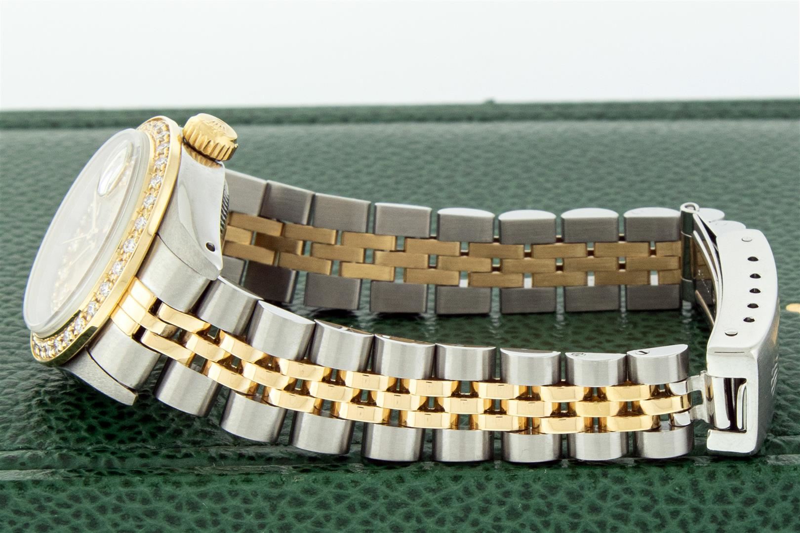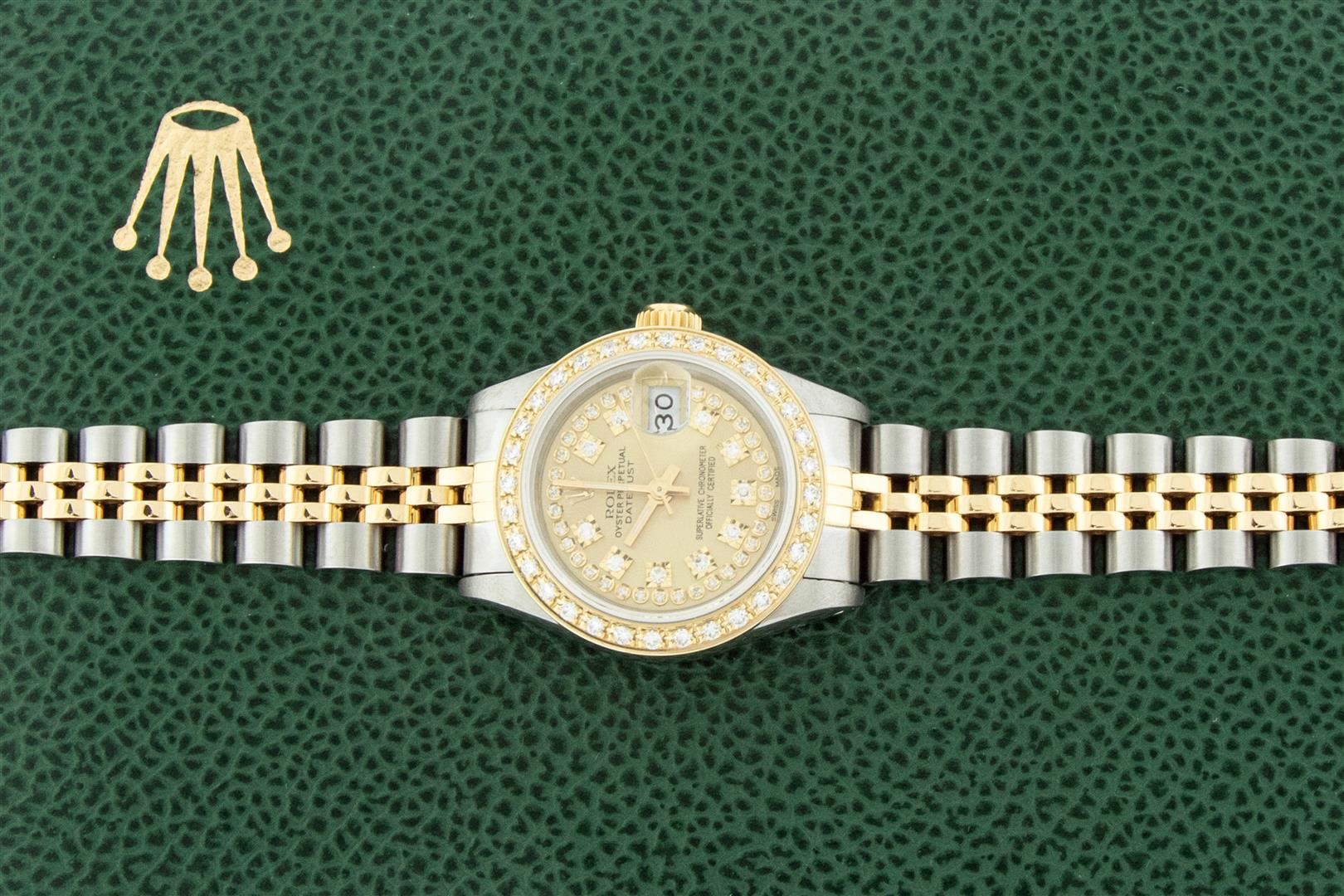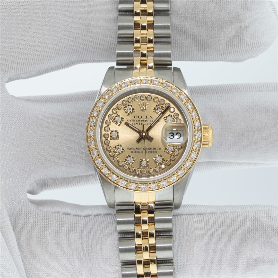 One Ladies Two Tone Rolex Datejust Polished, Serviced & Electronically Tested, Yellow Gold & Stainless Steel Case: 26mm, Rolex Yellow Gold Crown, Custom Bezel: New 18K New Yellow Gold Beadset Diamond Bezel, Diamond Count: 32 Diamonds On Bezel, Total Bezel Weight .70 Carat, Clarity: SI-VS, Color: G to H. Custom Crystal: New Sapphire With Magnified Date Window. Custom Hands: New Luminescent Hands. Rolex Movement: Automatic Winding Movement. Custom Dial: Refinished To Champagne With Added Diamond Hour Markers, Diamond Count: 43 Diamonds In Dial, Clarity: SI-VS, Color: G to H. Date Window: 3 O'clock Position Date Display, Model: Datejust. Condition: G-6 Extra Fine. Rolex Bracelet: Two Tone Yellow Gold & Stainless Steel Jubilee Band. Bright Polish. 6.0 Inch Length, Adjustable. Standard Clasp, With Rolex Logo. This Pre Owned Watch Has Been Serviced Time Tested And Is In Excellent Condition It Is Free Of All Scratches And Dents. This Watch Comes With A Rolex Box.