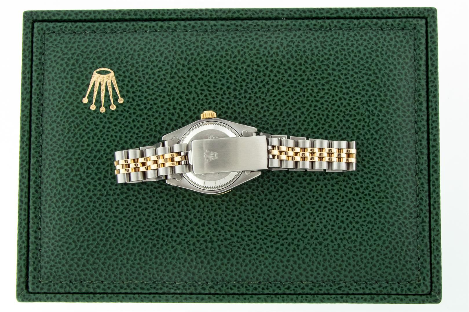 One Ladies Two Tone Rolex Datejust Polished, Serviced & Electronically Tested, Yellow Gold & Stainless Steel Case: 26mm, Rolex Yellow Gold Crown, Custom Bezel: New 18K New Yellow Gold Beadset Diamond Bezel, Diamond Count: 32 Diamonds On Bezel, Total Bezel Weight .70 Carat, Clarity: SI-VS, Color: G to H. Custom Crystal: New Sapphire With Magnified Date Window. Custom Hands: New Luminescent Hands. Rolex Movement: Automatic Winding Movement. Custom Dial: Refinished To Champagne With Added Diamond Hour Markers, Diamond Count: 43 Diamonds In Dial, Clarity: SI-VS, Color: G to H. Date Window: 3 O'clock Position Date Display, Model: Datejust. Condition: G-6 Extra Fine. Rolex Bracelet: Two Tone Yellow Gold & Stainless Steel Jubilee Band. Bright Polish. 6.0 Inch Length, Adjustable. Standard Clasp, With Rolex Logo. This Pre Owned Watch Has Been Serviced Time Tested And Is In Excellent Condition It Is Free Of All Scratches And Dents. This Watch Comes With A Rolex Box.