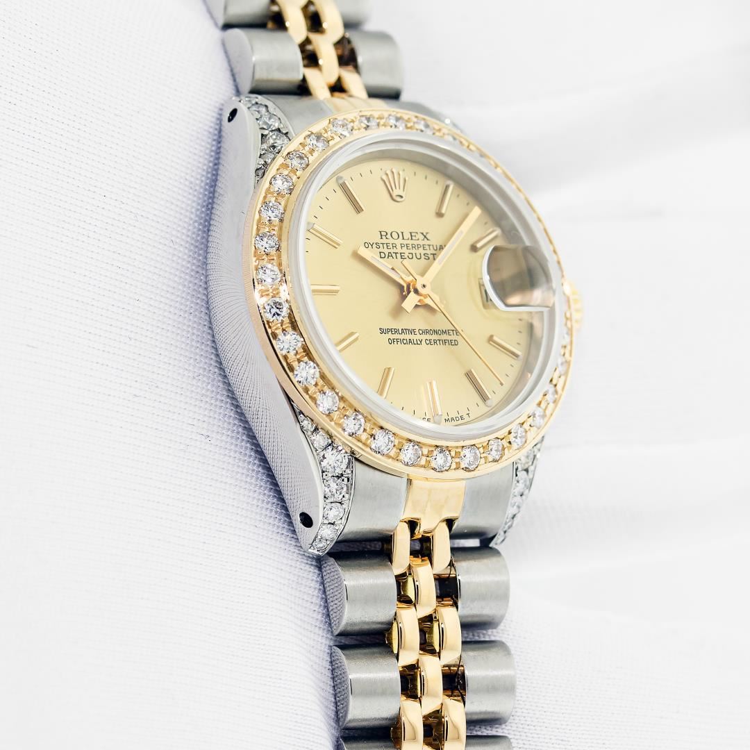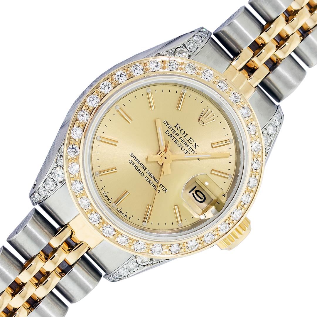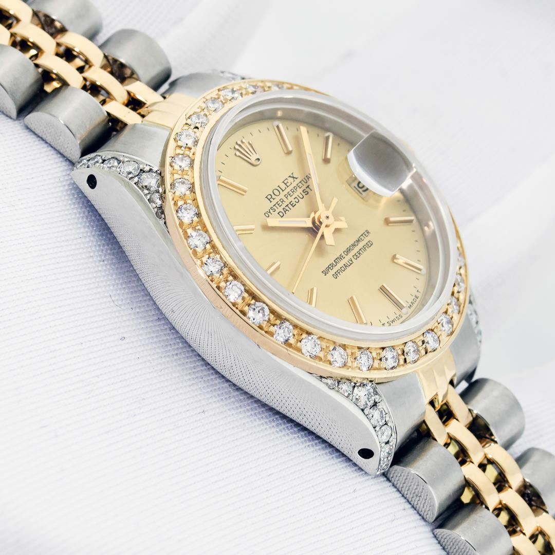 Rolex Ladies Pre Owned Quickset 18K Yellow Gold and Stainless Steel Two Tone Wristwatch Polished Bright with Satin Finish, Serviced & Electronically Tested, Rolex Stainless Steel Case: 26mm, Custom Diamond Lugs: Added Diamonds On Lugs, Diamond Count: 24 Diamonds On Lugs, Color: G To H, Clarity: SI-VS. Rolex Yellow Gold Crown, Custom Bezel: New 18K Yellow Gold Beadset Diamond Bezel, Diamond Count: 32 Diamonds On Bezel. Custom Crystal: New Sapphire With Magnified Date Window. Custom Hands: New Hands. Rolex Movement: Automatic Winding Movement. Rolex Dial: Champagne Dial With Dash Track & Lumi Dots, Date Window: 3 O'Clock Position Date Display, Model: Quickset Datejust, Condition: G-6 Extra Fine. Rolex Bracelet: Stainless Steel and 18K Yellow Gold Jubilee Band. Bright Polish & Satin Finish. 6.0 Inch Length, Adjustable. Standard Clasp, With Rolex Logo. This Watch Has Been Serviced Time Tested And Is In Excellent Condition It Is Free Of All Scratches And Dents.