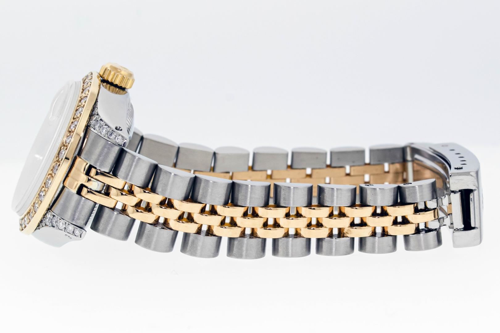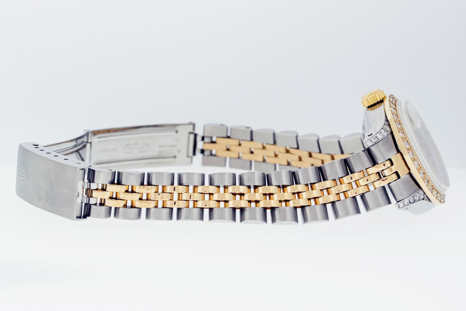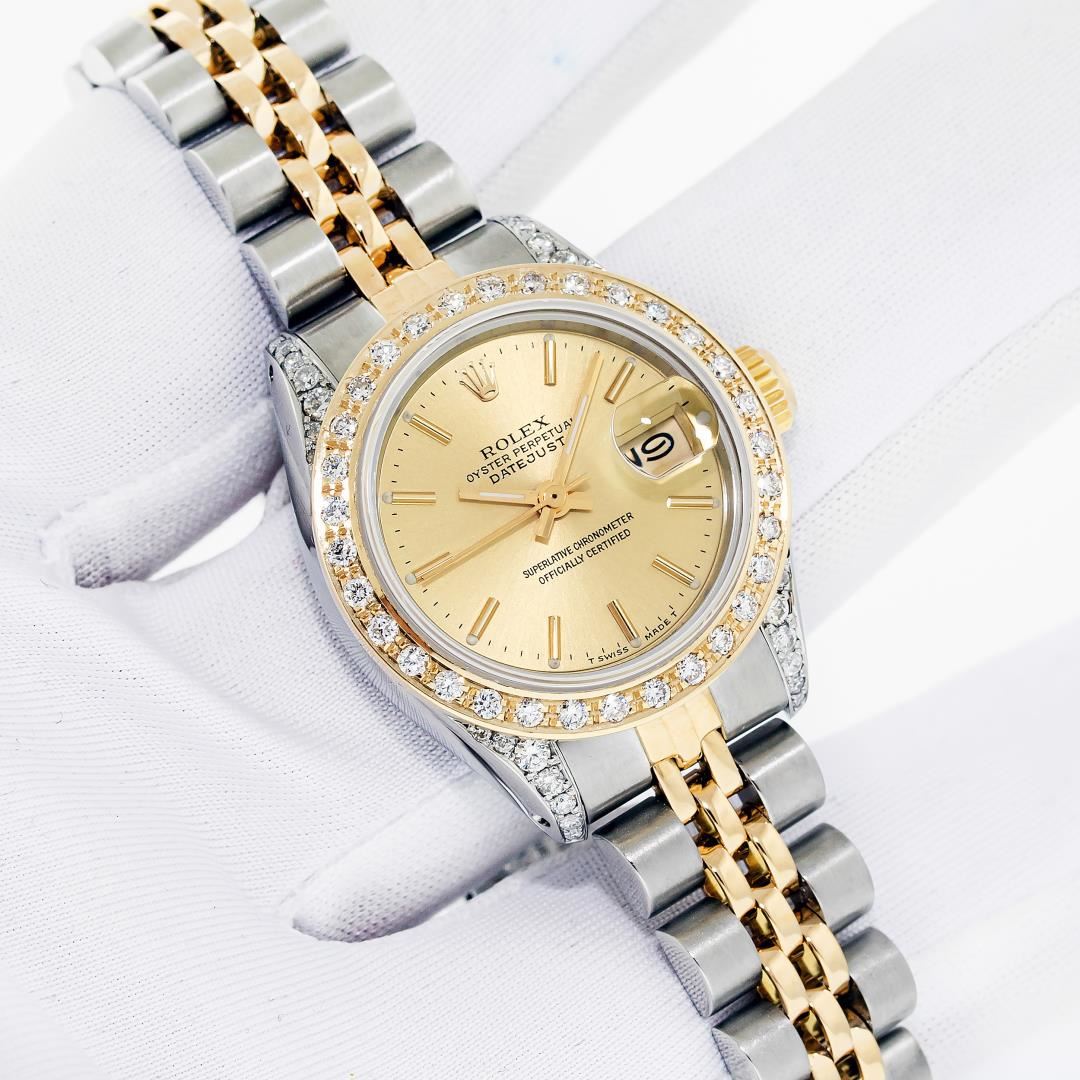 Rolex Ladies Pre Owned Quickset 18K Yellow Gold and Stainless Steel Two Tone Wristwatch Polished Bright with Satin Finish, Serviced & Electronically Tested, Rolex Stainless Steel Case: 26mm, Custom Diamond Lugs: Added Diamonds On Lugs, Diamond Count: 24 Diamonds On Lugs, Color: G To H, Clarity: SI-VS. Rolex Yellow Gold Crown, Custom Bezel: New 18K Yellow Gold Beadset Diamond Bezel, Diamond Count: 32 Diamonds On Bezel. Custom Crystal: New Sapphire With Magnified Date Window. Custom Hands: New Hands. Rolex Movement: Automatic Winding Movement. Rolex Dial: Champagne Dial With Dash Track & Lumi Dots, Date Window: 3 O'Clock Position Date Display, Model: Quickset Datejust, Condition: G-6 Extra Fine. Rolex Bracelet: Stainless Steel and 18K Yellow Gold Jubilee Band. Bright Polish & Satin Finish. 6.0 Inch Length, Adjustable. Standard Clasp, With Rolex Logo. This Watch Has Been Serviced Time Tested And Is In Excellent Condition It Is Free Of All Scratches And Dents.
