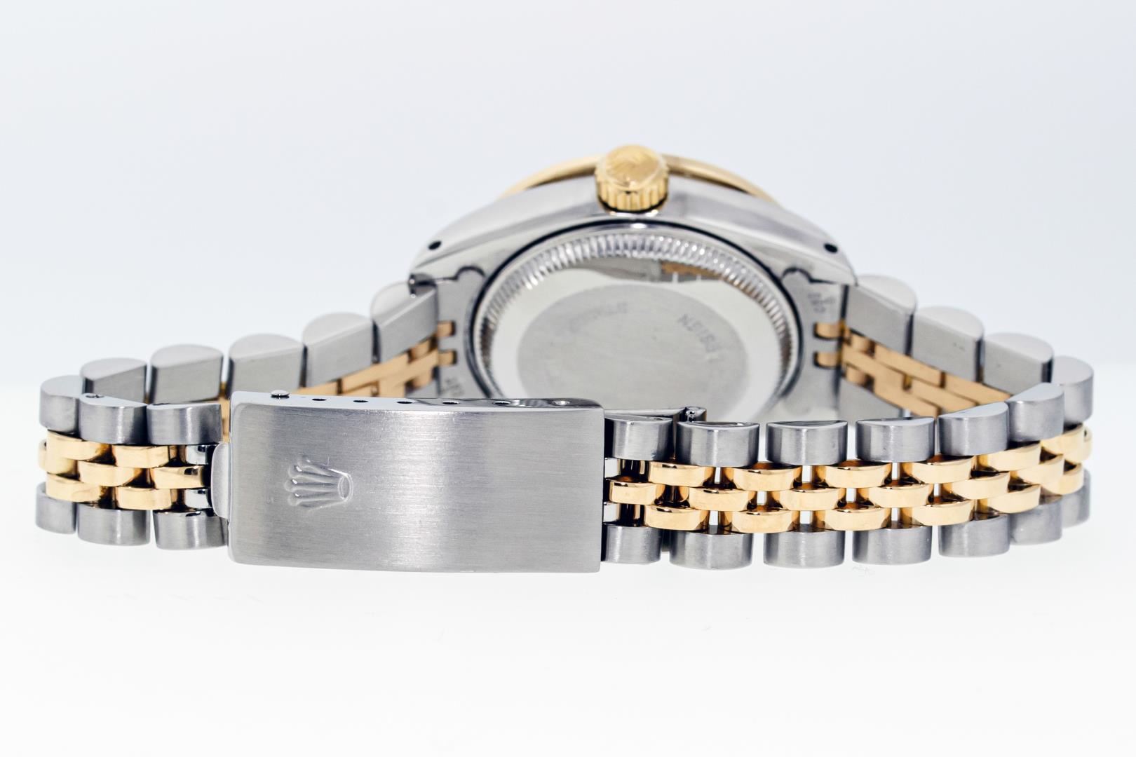 Rolex Ladies Pre Owned Quickset 18K Yellow Gold and Stainless Steel Two Tone Wristwatch Polished Bright with Satin Finish, Serviced & Electronically Tested, Rolex Stainless Steel Case: 26mm, Custom Diamond Lugs: Added Diamonds On Lugs, Diamond Count: 24 Diamonds On Lugs, Color: G To H, Clarity: SI-VS. Rolex Yellow Gold Crown, Custom Bezel: New 18K Yellow Gold Beadset Diamond Bezel, Diamond Count: 32 Diamonds On Bezel. Custom Crystal: New Sapphire With Magnified Date Window. Custom Hands: New Hands. Rolex Movement: Automatic Winding Movement. Rolex Dial: Champagne Dial With Dash Track & Lumi Dots, Date Window: 3 O'Clock Position Date Display, Model: Quickset Datejust, Condition: G-6 Extra Fine. Rolex Bracelet: Stainless Steel and 18K Yellow Gold Jubilee Band. Bright Polish & Satin Finish. 6.0 Inch Length, Adjustable. Standard Clasp, With Rolex Logo. This Watch Has Been Serviced Time Tested And Is In Excellent Condition It Is Free Of All Scratches And Dents.