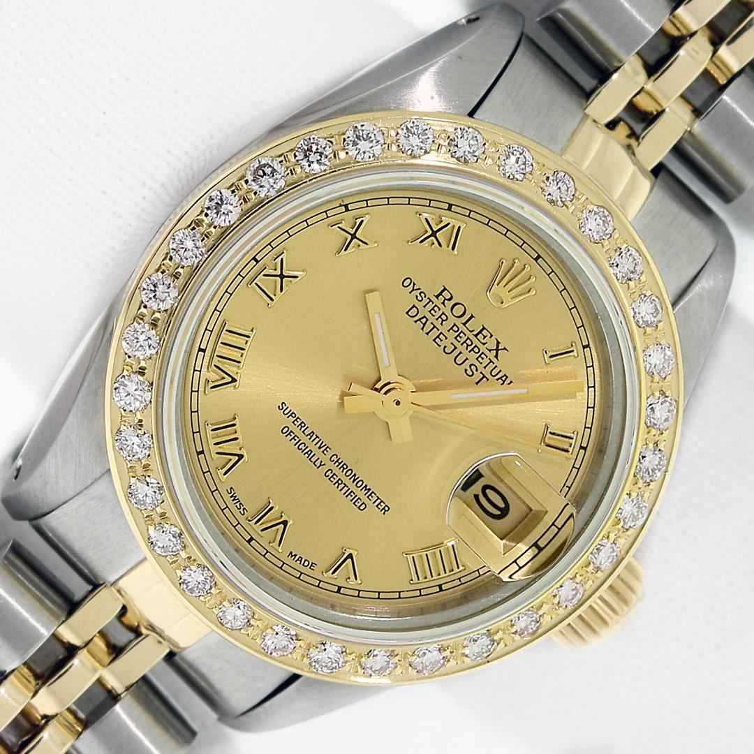 One Ladies Pre Owned Quickset 18K Yellow Gold and Stainless Steel Two Tone Rolex Wristwatch Polished Bright with Satin Finish, Serviced & Electronically Tested, Rolex Stainless Steel Case: 26mm, Rolex Yellow Gold Crown, Custom Bezel: New 18K Yellow Gold Beadset Diamond Bezel, Diamond Count: 32 Diamonds On Bezel. Custom Crystal: New Sapphire With Magnified Date Window. Custom Hands: New Hands. Rolex Movement: Automatic Winding Movement. Rolex Dial: Champagne Dial With Roman Hour Markers And Square Track, Date Window: 3 O'Clock Position Date Display, Model: Datejust, Condition: G-6 Extra Fine. Rolex Bracelet: Stainless Steel and 18K Yellow Gold Jubilee Band. Bright Polish & Satin Finish. 6.0 Inch Length, Adjustable. Standard Clasp, With Rolex Logo. This Watch Has Been Serviced Time Tested And Is In Excellent Condition It Is Free Of All Scratches And Dents.