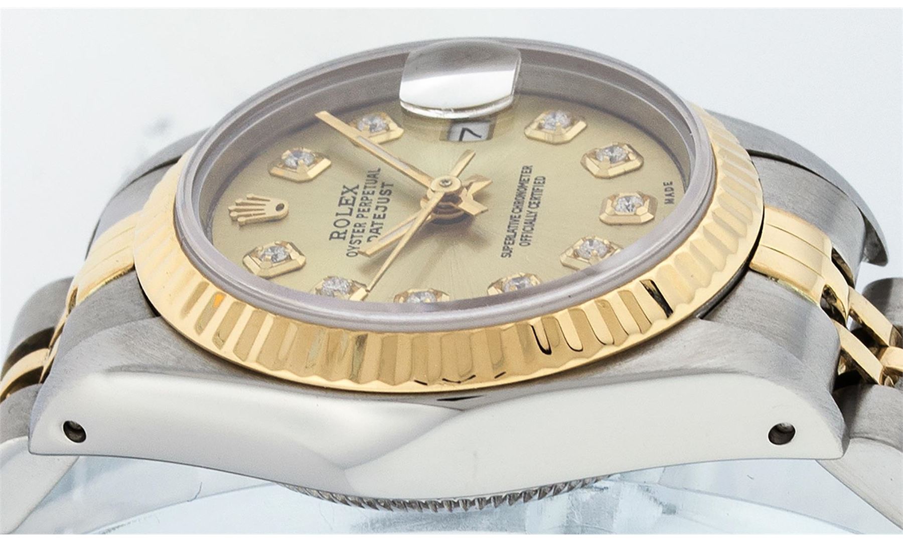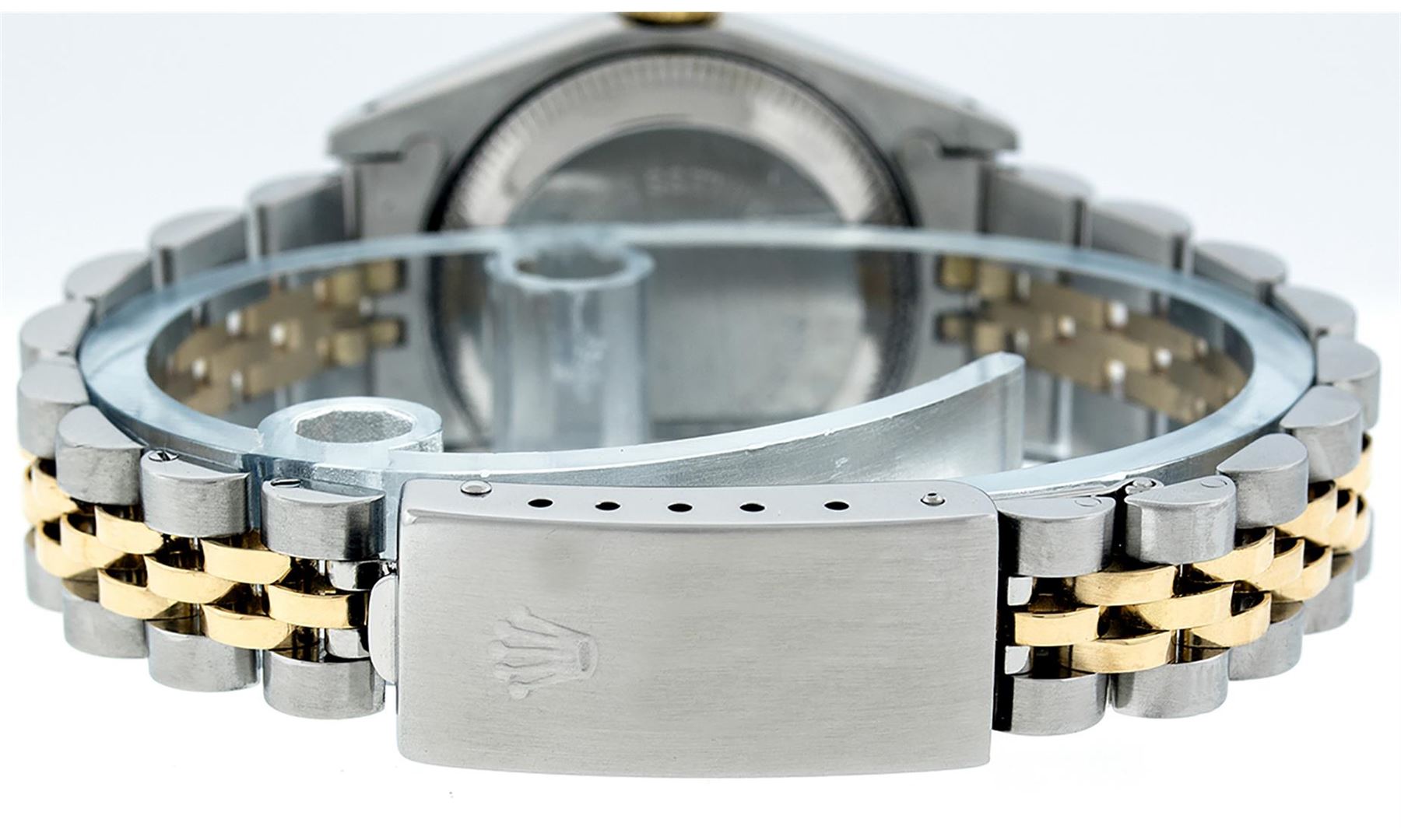 One Ladies Two Tone Rolex Datejust Polished, Serviced & Electronically Tested, Yellow Gold & Stainless Steel Case: 26mm, Yellow Gold Crown, Bezel: Yellow Gold Fluted Bezel. Custom Crystal: New Acrylic Cyclops Lens. Custom Hands: New Luminescent Hands. Movement: Automatic Winding Movement. Custom Dial: Champagne With Diamond Hour Markers, Diamond Count: 10 Diamonds In Dial, Color: G to H, Clarity: VS2-SI1. Date Window: 3 O'clock Position Date Display, Model: Datejust. Condition: G-6 Extra Fine. Bracelet: Two Tone Yellow Gold & Stainless Steel Jubilee. Bright Polish. 6.0 Inch Length, Adjustable. Standard Clasp, With Rolex Logo. This Watch Has Been Serviced Time Tested And Is In Excellent Condition It Is Free Of All Scratches And Dents.