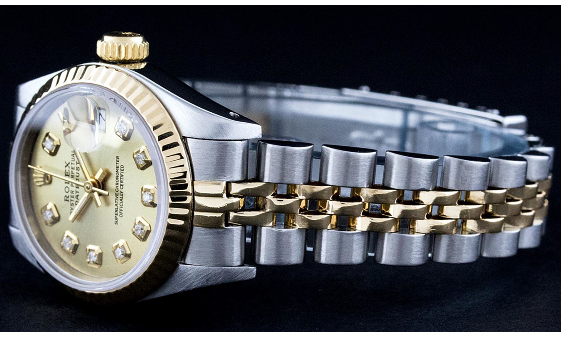 One Ladies Pre Owned Two Tone Rolex Datejust Polished, Serviced & Electronically Tested, Yellow Gold & Stainless Steel Case: 26mm, Yellow Gold Crown, Rolex Bezel: Rolex Yellow Gold Fluted Bezel. Custom Crystal: New Acrylic Cyclops Lens. Custom Hands: New Luminescent Hands. Rolex Movement: Automatic Winding Movement. Custom Dial: Refinished To Champagne With Diamond Hour Markers, Diamond Count: 10 Diamonds In Dial, Color: G to H, Clarity: VS2-SI1. Date Window: 3 O'Clock Position Date Display, Model: Datejust. Condition: G-6 Extra Fine. Rolex Bracelet: Two Tone Yellow Gold & Stainless Steel Jubilee Band. Bright Polish. 6.0 Inch Length, Adjustable. Standard Clasp, With Rolex Logo. This Watch Has Been Serviced Time Tested And Is In Excellent Condition It Is Free Of All Scratches And Dents.