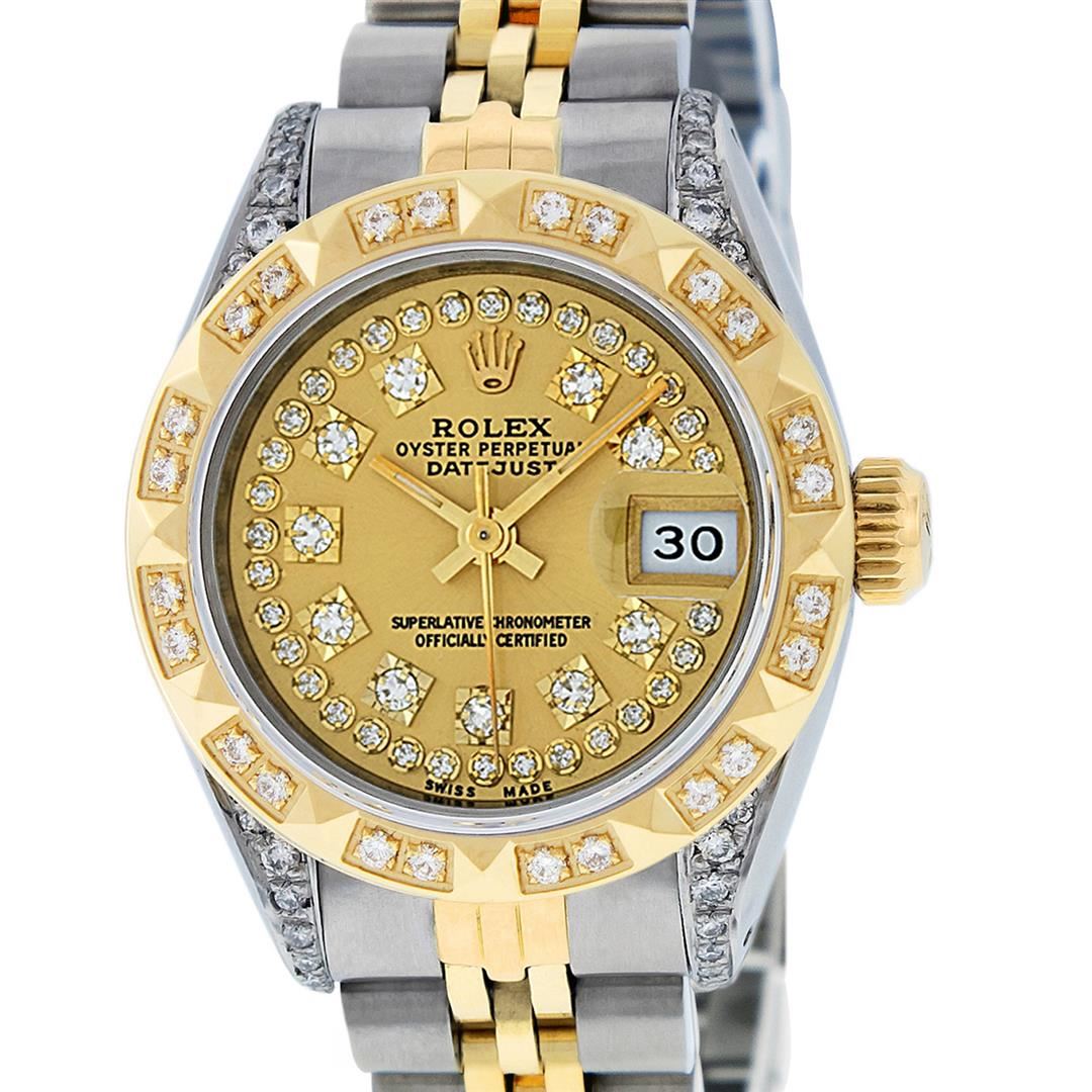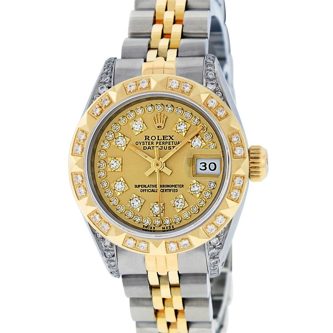 One Ladies Two Tone Rolex Datejust Polished, Serviced & Electronically Tested, Yellow Gold & Stainless Steel Case: 26mm, Yellow Gold Crown, Diamond Lugs: 24 Diamonds On Lugs, Clarity: SI-VS, Color: G to H, Clarity SI-VS. Custom Bezel: New 18K Yellow Gold Pyramid Diamond Bezel, Diamond Count: 24 Diamonds, Total Weight For Bezel .50 Carat, Clarity: SI-VS, Color: G to H. Custom Crystal: New Scratch Resistant Synthetic Sapphire Cyclops Lens. Custom Hands: New Luminescent Hands. Movement: Automatic Winding Movement. Custom Dial: Champagne With Single Cut Diamond Hour Markers, Diamond Count: 43 Diamonds In Dial, Clarity: SI-VS, Color: G to H. Date Window: 3 O'clock Position Date Display, Model: Datejust. Condition: G-6 Extra Fine. Bracelet: Two Tone Yellow Gold & Stainless Steel Jubilee. Bright Polish. 6.0 Inch Length, Adjustable. Standard Clasp, With Rolex Logo. This Watch Has Been Serviced Time Tested And Is In Excellent Condition It Is Free Of All Scratches And Dents.