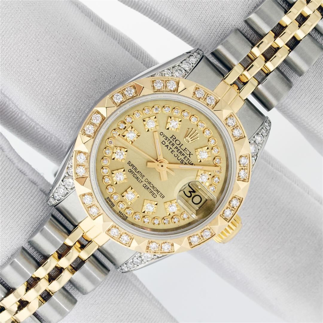One Ladies Two Tone Rolex Datejust Polished, Serviced & Electronically Tested, Rolex Yellow Gold & Stainless Steel Case: 26mm, Rolex Yellow Gold Crown, Custom Diamond Lugs: 24 Diamonds On Lugs, Clarity: SI-VS, Color: G to H, Clarity SI-VS. Custom Bezel: New 18K Yellow Gold Pyramid Diamond Bezel, Diamond Count: 24 Diamonds, Total Weight For Bezel .50 Carat, Clarity: SI-VS, Color: G to H. Custom Crystal: New Scratch Resistant Synthetic Sapphire Cyclops Lens. Custom Hands: New Luminescent Hands. Rolex Movement: Automatic Winding Movement. Custom Dial: Refinished To Champagne With Added Diamond Hour Markers, Diamond Count: 43 Diamonds In Dial, Clarity: SI-VS, Color: G to H. Date Window: 3 O'clock Position Date Display, Model: Datejust. Condition: G-6 Extra Fine. Rolex Bracelet: Two Tone Yellow Gold & Stainless Steel Jubilee Band. Bright Polish. 6.0 Inch Length, Adjustable. Standard Clasp, With Rolex Logo. This Pre Owned Watch Has Been Serviced Time Tested And Is In Excellent Condition It Is Free Of All Scratches And Dents. This Watch Comes With A Rolex Box.