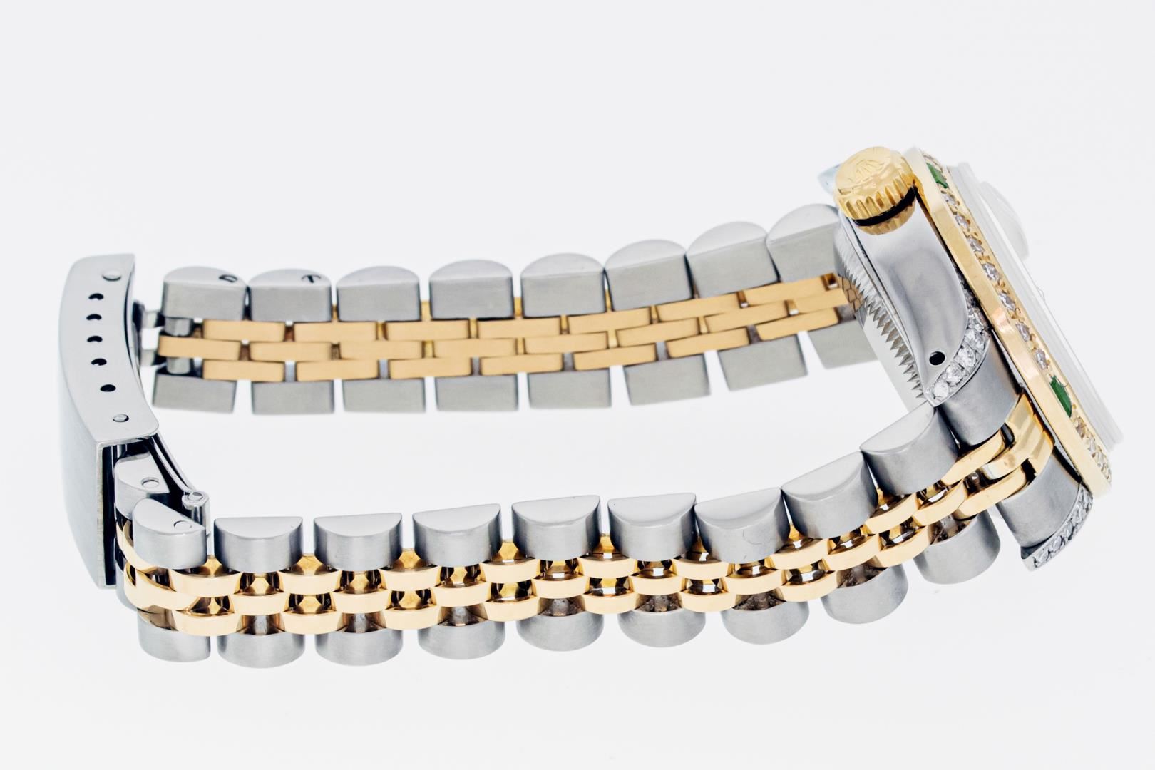 Rolex Ladies Pre Owned Quickset 18K Yellow Gold and Stainless Steel Two Tone Wristwatch Polished Bright with Satin Finish, Serviced & Electronically Tested, Rolex Stainless Steel Case: 26mm, Custom Diamond Lugs: Added Diamonds On Lugs, Diamond Count: 24 Diamonds On Lugs, Color: G To H, Clarity: SI-VS. Rolex Yellow Gold Crown, Custom Bezel: New 18K Yellow Gold Beadset And Emerald Diamond Bezel, Stone Count: 28 Diamonds + 4 Emeralds On Bezel. Custom Crystal: New Sapphire With Magnified Date Window. Custom Hands: New Hands. Rolex Movement: Automatic Winding Movement. Rolex Dial: Champagne Dial With Dash Track & Lumi Dots, Date Window: 3 O'Clock Position Date Display, Model: Quickset Datejust, Condition: G-6 Extra Fine. Rolex Bracelet: Stainless Steel and 18K Yellow Gold Jubilee Band. Bright Polish & Satin Finish. 6.0 Inch Length, Adjustable. Standard Clasp, With Rolex Logo. This Watch Has Been Serviced Time Tested And Is In Excellent Condition It Is Free Of All Scratches And Dents.