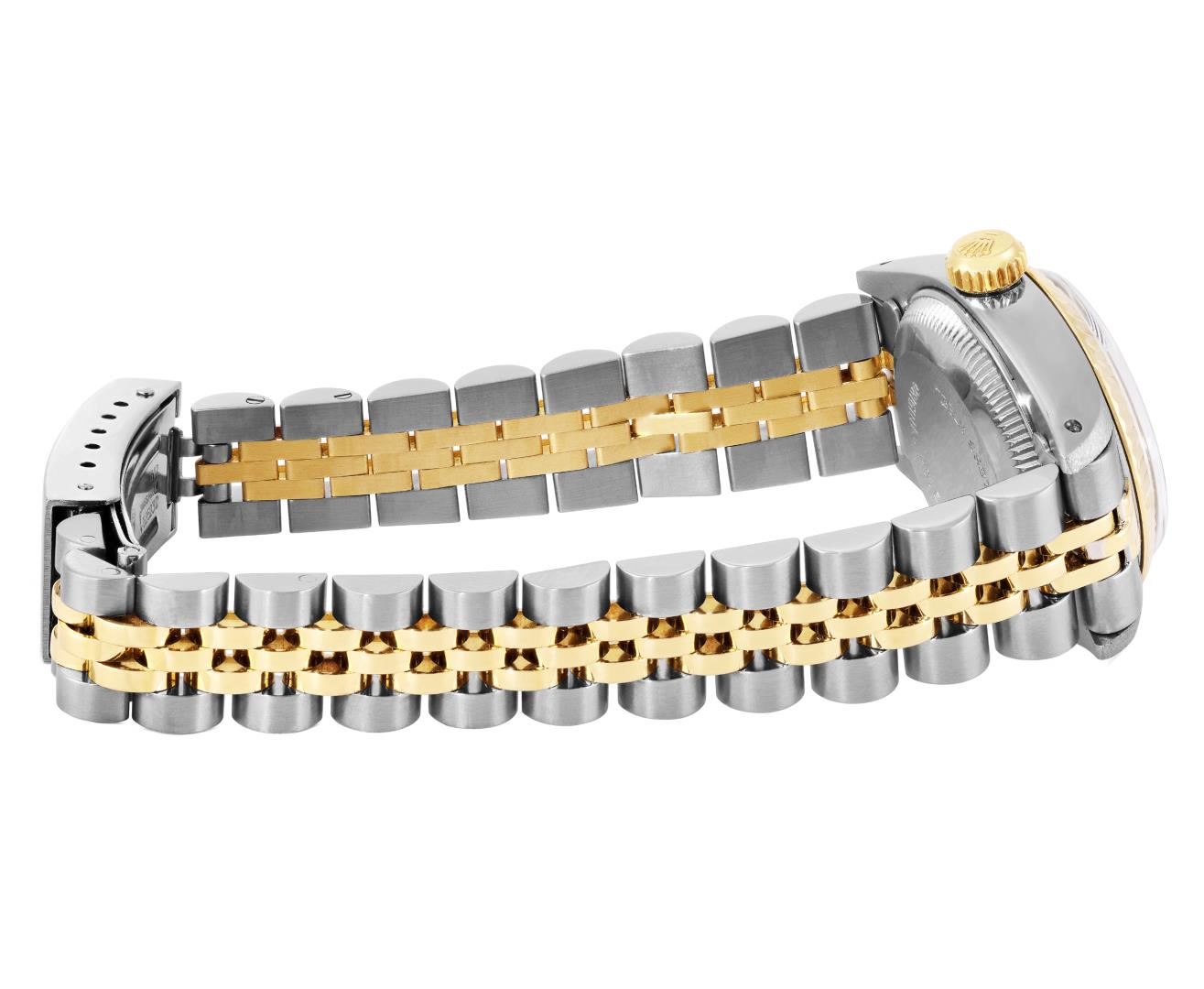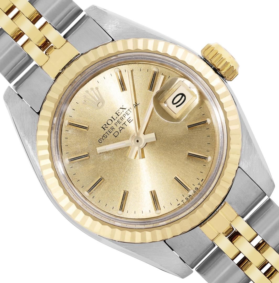 One Rolex Ladies Pre Owned Two Tone Yellow Gold And Stainless Steel Rolex Date Polished, Serviced & Electronically Tested, Rolex Yellow Gold & Stainless Steel Case: 26mm, Rolex Yellow Gold Crown, 14K Rolex Yellow Gold Fluted Bezel. Custom Crystal: New Acrylic With Magnifying Date Window. Custom Hands: Luminescent Hands. Rolex Movement: 2035 Automatic Winding Movement. Rolex Factory Dial: Champagne With Diamond Hour Markers And Dash Track. Date Window: 3 O'clock Position Date Display, Condition: G-6 Extra Fine. Rolex Bracelet: Two Tone 14K Yellow Gold And Stainless Steel Jubilee Band. Bright Polish & Satin Finish. 6.0 Inch Length, Adjustable. Standard Clasp, With Rolex Logo. This Watch Has Been Serviced Time Tested And Is In Excellent Condition It Is Free Of All Scratches And Dents. This Watch Comes With A Rolex Box.