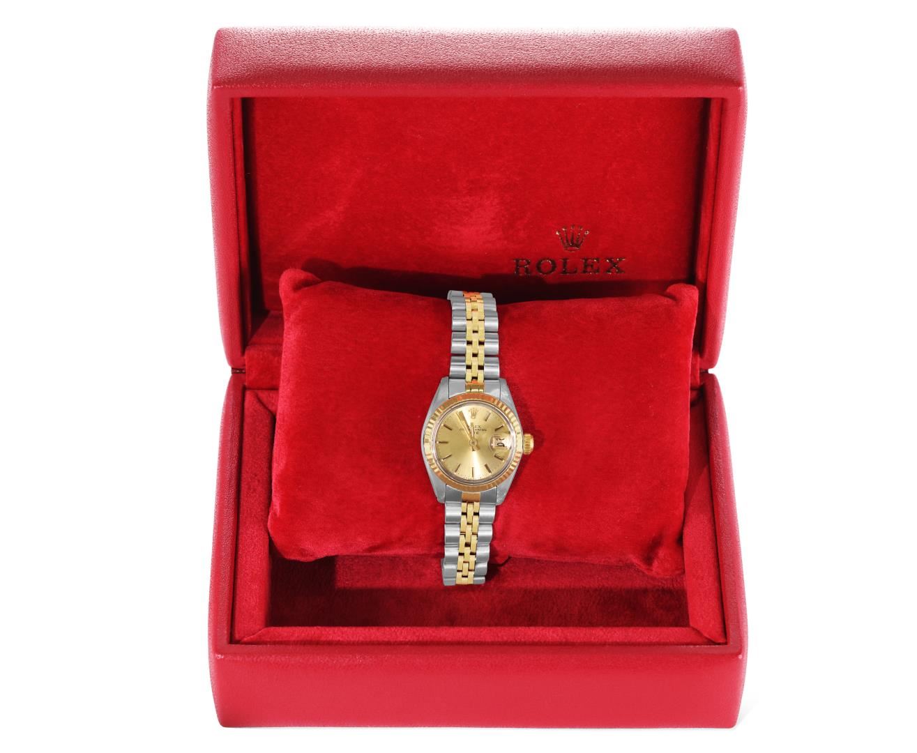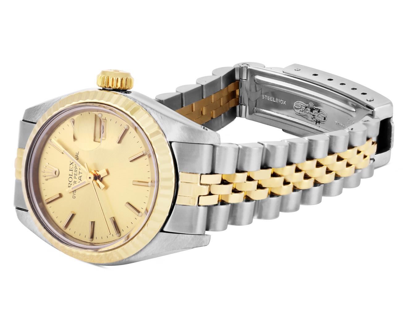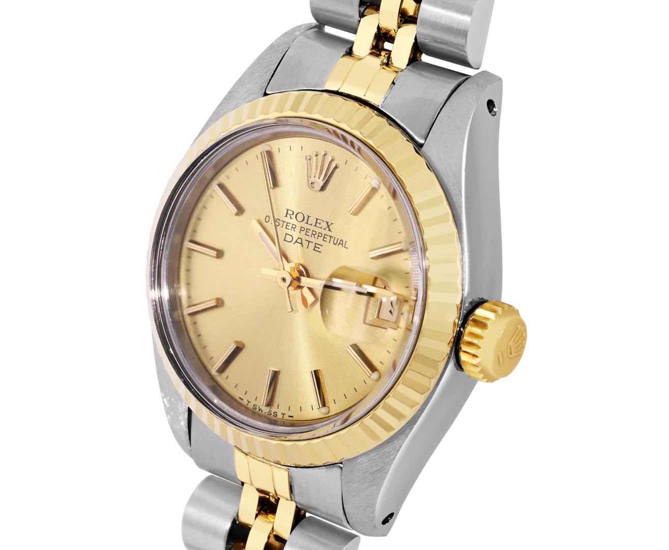 One Rolex Ladies Pre Owned Two Tone Yellow Gold And Stainless Steel Rolex Date Polished, Serviced & Electronically Tested, Rolex Yellow Gold & Stainless Steel Case: 26mm, Rolex Yellow Gold Crown, 14K Rolex Yellow Gold Fluted Bezel. Custom Crystal: New Acrylic With Magnifying Date Window. Custom Hands: Luminescent Hands. Rolex Movement: 2035 Automatic Winding Movement. Rolex Factory Dial: Champagne With Diamond Hour Markers And Dash Track. Date Window: 3 O'clock Position Date Display, Condition: G-6 Extra Fine. Rolex Bracelet: Two Tone 14K Yellow Gold And Stainless Steel Jubilee Band. Bright Polish & Satin Finish. 6.0 Inch Length, Adjustable. Standard Clasp, With Rolex Logo. This Watch Has Been Serviced Time Tested And Is In Excellent Condition It Is Free Of All Scratches And Dents. This Watch Comes With A Rolex Box.