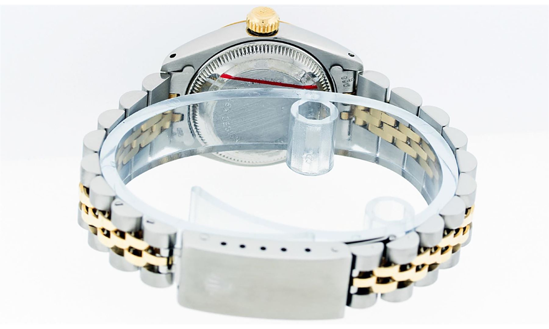 One Ladies Pre Owned Two Tone 14K Yellow Gold And Stainless Steel Rolex Polished, Serviced & Electronically Tested, Rolex Yellow Gold & Stainless Steel Case: 26mm, Rolex Yellow Gold Crown, Rolex Bezel: Yellow Gold Fluted Bezel. Custom Crystal: New Plexiglass With Date Window. Hands: Luminescent Hands. Rolex Movement: Automatic Winding Movement 2030. Rolex Dial: Champagne Index With Roman Track & Lumi Dots. Date Window: 3 O'Clock Position Date Display, Model: Date. Condition: G-6 Extra Fine. Rolex Bracelet: Two Tone 14K Yellow Gold & Stainless Steel Jubilee Band. Bright Polish. 6.0 Inch Length, Adjustable. Standard Clasp, With Rolex Logo. This Watch Has Been Serviced Time Tested And Is In Excellent Condition It Is Free Of All Scratches And Dents.