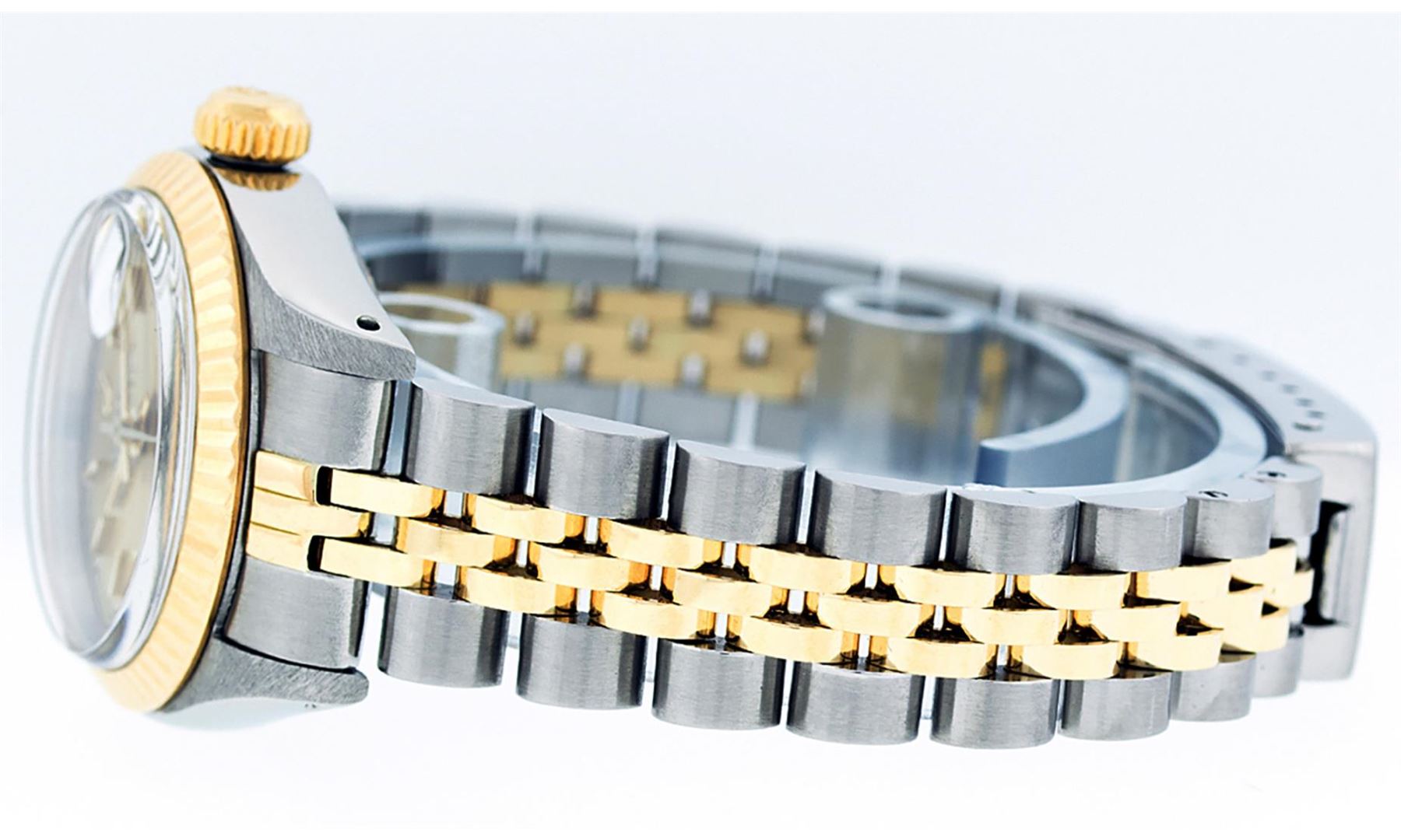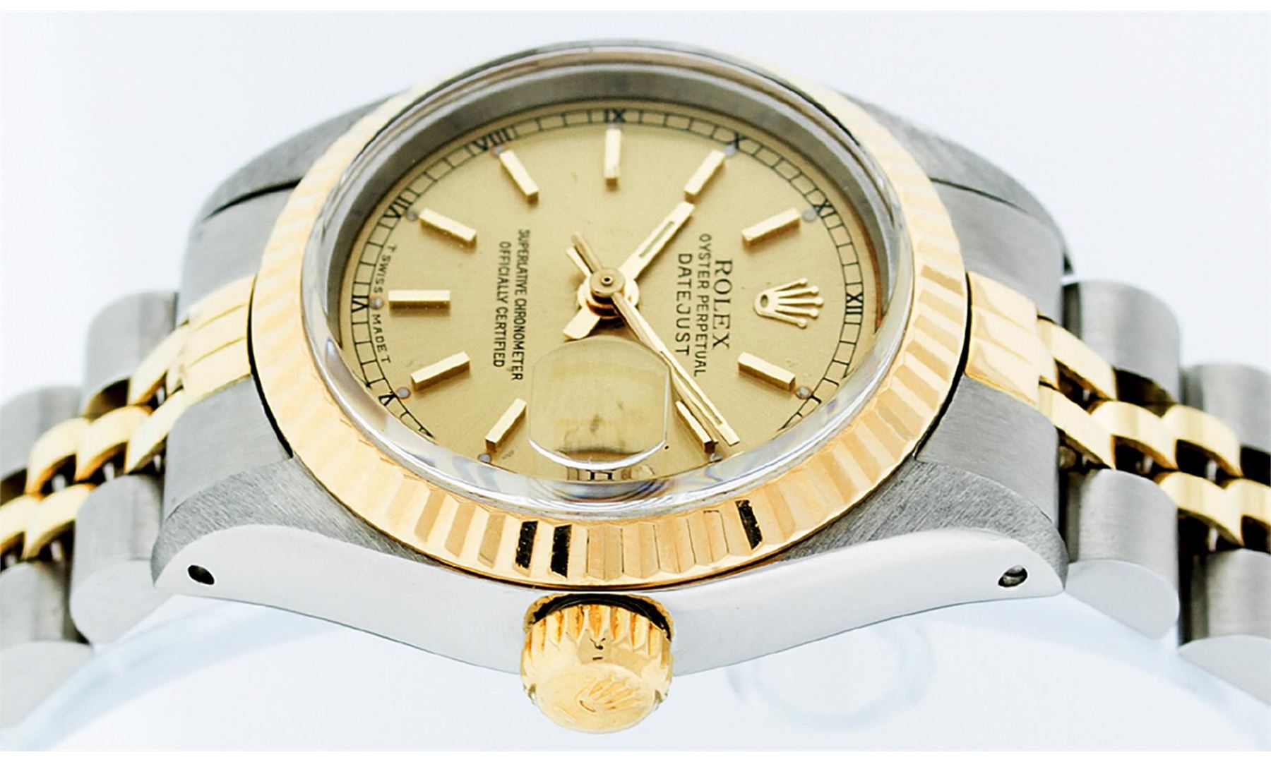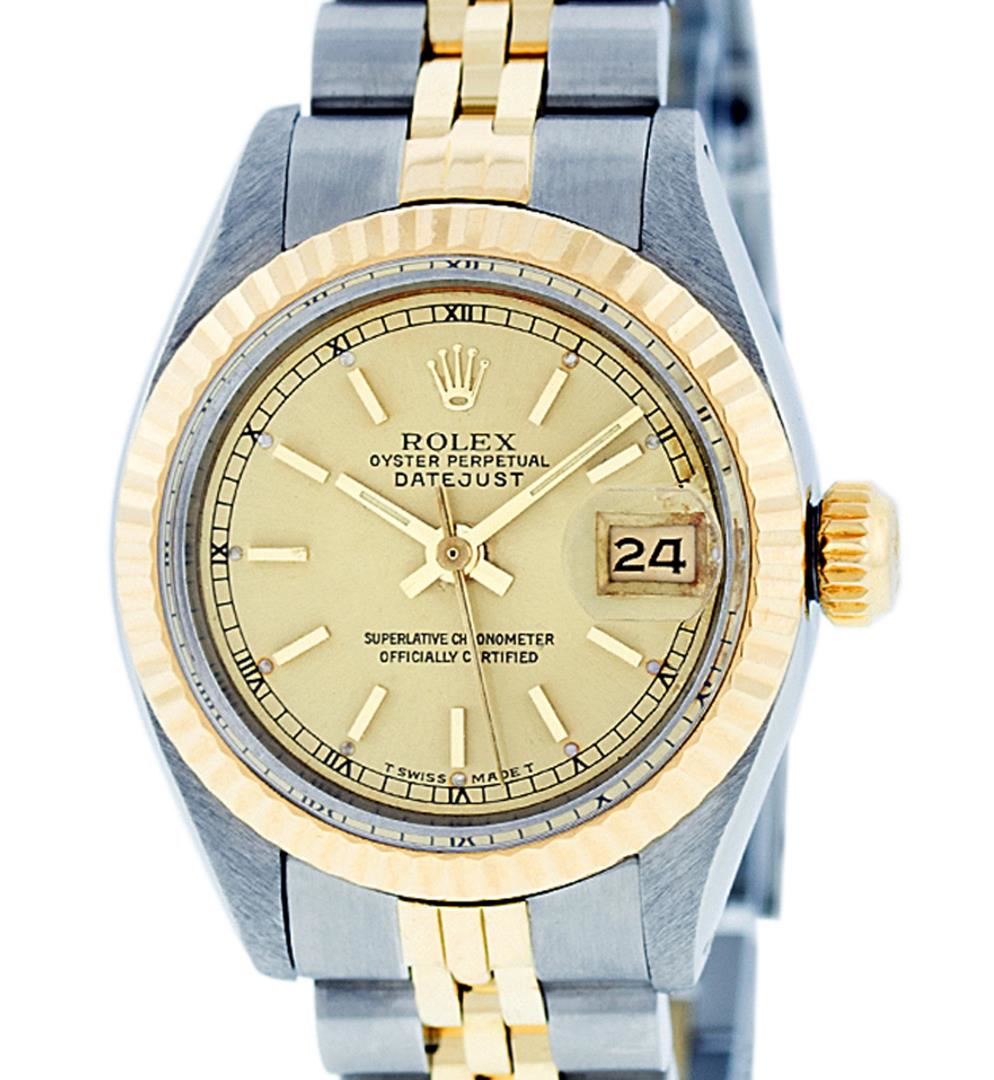 One Ladies Pre Owned Two Tone 14K Yellow Gold And Stainless Steel Rolex Polished, Serviced & Electronically Tested, Rolex Yellow Gold & Stainless Steel Case: 26mm, Rolex Yellow Gold Crown, Rolex Bezel: Yellow Gold Fluted Bezel. Custom Crystal: New Plexiglass With Date Window. Hands: Luminescent Hands. Rolex Movement: Automatic Winding Movement 2030. Rolex Dial: Champagne Index With Roman Track & Lumi Dots. Date Window: 3 O'Clock Position Date Display, Model: Date. Condition: G-6 Extra Fine. Rolex Bracelet: Two Tone 14K Yellow Gold & Stainless Steel Jubilee Band. Bright Polish. 6.0 Inch Length, Adjustable. Standard Clasp, With Rolex Logo. This Watch Has Been Serviced Time Tested And Is In Excellent Condition It Is Free Of All Scratches And Dents.