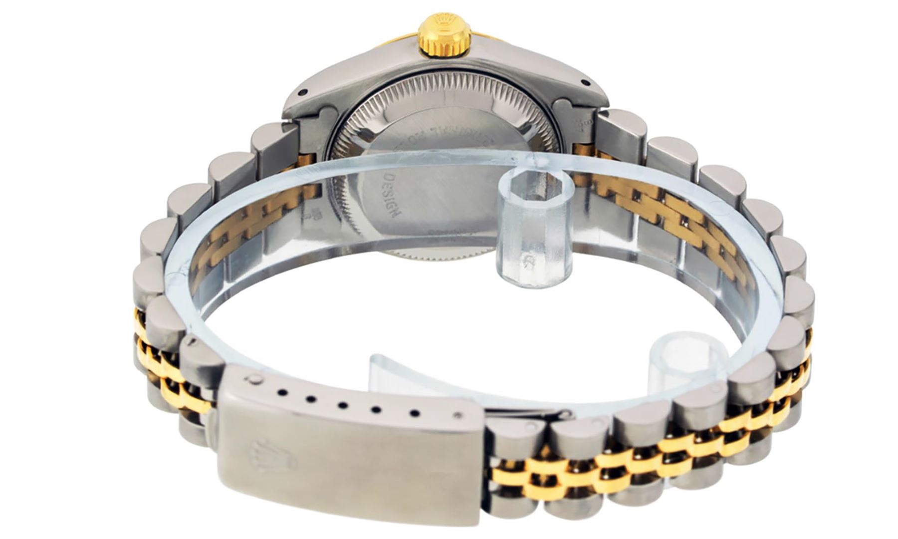 One Ladies Pre Owned Two Tone 14K Yellow Gold & Stainless Steel Rolex Polished, Serviced & Electronically Tested, Yellow Gold & Stainless Steel Case: 26mm, Yellow Gold Crown, Rolex Bezel: 14K Yellow Gold Fluted Bezel. Crystal: Plexiglass With Magnified Date Window. Hands: Luminescent Hands. Rolex Movement: Automatic Winding Movement 2030. Rolex Dial: Champagne Index With Luminescent Dots. Date Window: 3 O'Clock Position Date Display, Model: Date. Condition: G-6 Extra Fine. Rolex Bracelet: Two Tone 14K Yellow Gold & Stainless Steel Jubilee Band. Bright Polish. 6.0 Inch Length, Adjustable. Standard Clasp, With Rolex Logo. This Watch Has Been Serviced Time Tested And Is In Excellent Condition It Is Free Of All Scratches And Dents.