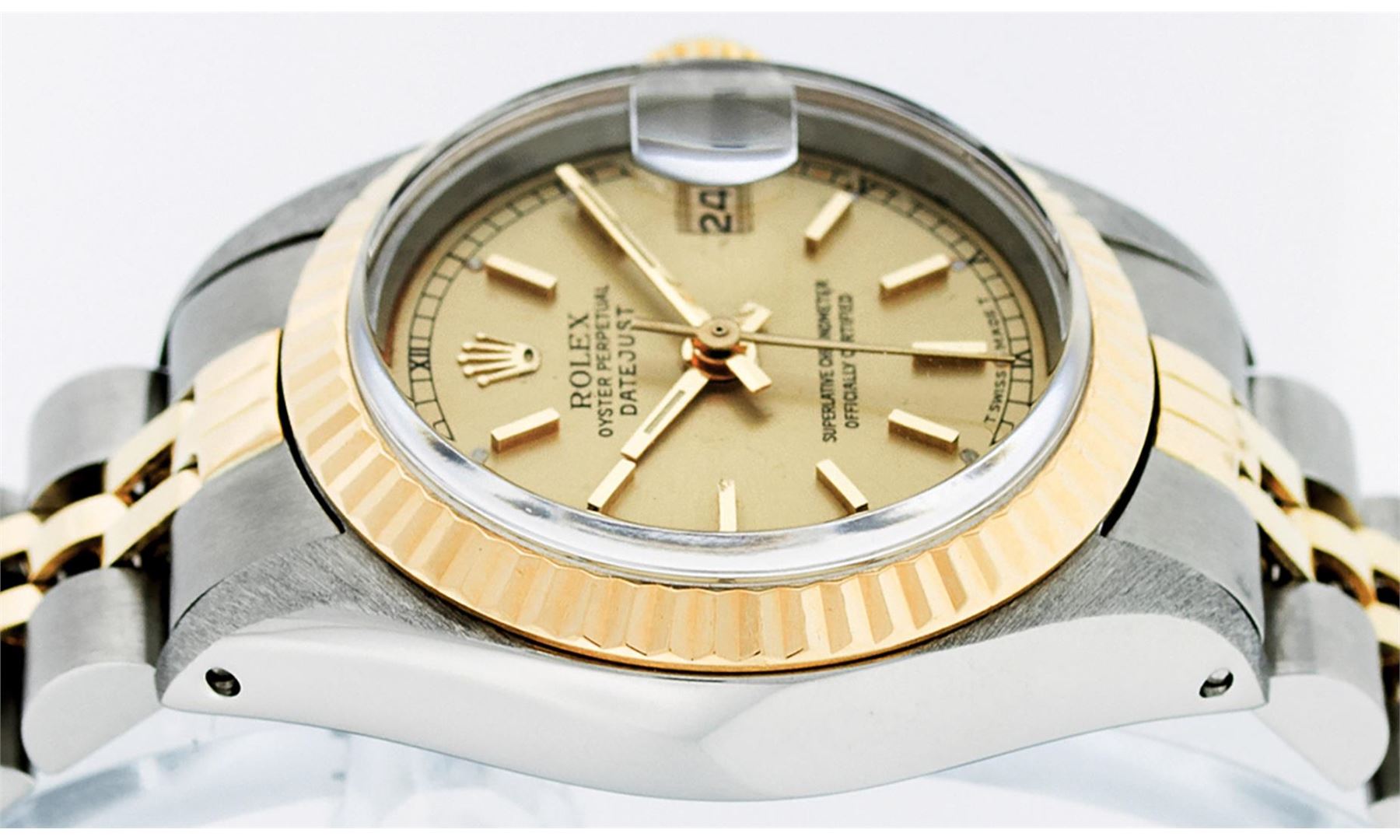 One Ladies Pre Owned Two Tone 14K Yellow Gold And Stainless Steel Rolex Polished, Serviced & Electronically Tested, Rolex Yellow Gold & Stainless Steel Case: 26mm, Rolex Yellow Gold Crown, Rolex Bezel: Yellow Gold Fluted Bezel. Custom Crystal: New Plexiglass With Date Window. Hands: Luminescent Hands. Rolex Movement: Automatic Winding Movement 2030. Rolex Dial: Champagne Index With Roman Track & Lumi Dots. Date Window: 3 O'Clock Position Date Display, Model: Date. Condition: G-6 Extra Fine. Rolex Bracelet: Two Tone 14K Yellow Gold & Stainless Steel Jubilee Band. Bright Polish. 6.0 Inch Length, Adjustable. Standard Clasp, With Rolex Logo. This Watch Has Been Serviced Time Tested And Is In Excellent Condition It Is Free Of All Scratches And Dents.