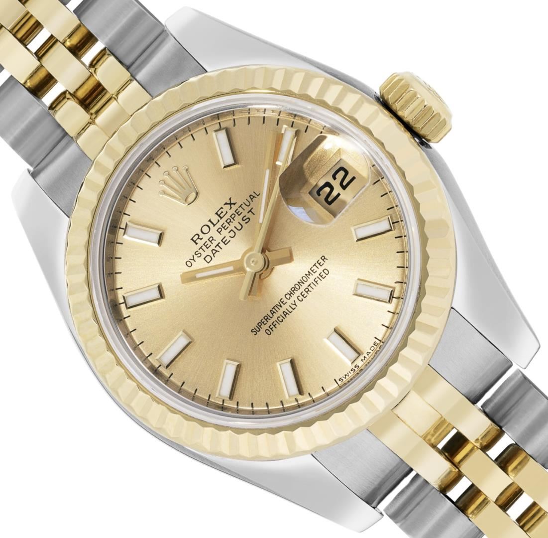 One Rolex Ladies Pre Owned Two Tone 18K Yellow Gold And Stainless Steel Rolex Datejust Polished, Serviced And Electronically Tested, Rolex Yellow Gold And Stainless Steel Case: 26mm, Rolex Yellow Gold Crown. Rolex 18K Yellow Gold Fluted Bezel. Crystal: Sapphire Crystal With Date Window. Hands: Luminescent Hands. Rolex Movement: 2235 Automatic Winding Movement. Rolex Dial: Factory Champagne Index Dial. Date Window: 3 O'Clock Position Date Display, Condition: G-6 Extra Fine. Rolex Bracelet: Two Tone 18K Yellow Gold And Stainless Steel Jubilee Band. Bright Polish And Satin Finish. 6.0 Inch Length, Adjustable. Hidden Clasp, With Rolex Logo. This Watch Has Been Serviced Time Tested And Is In Excellent Condition It Is Free Of All Scratches And Dents. This Watch Comes With A Rolex Box.