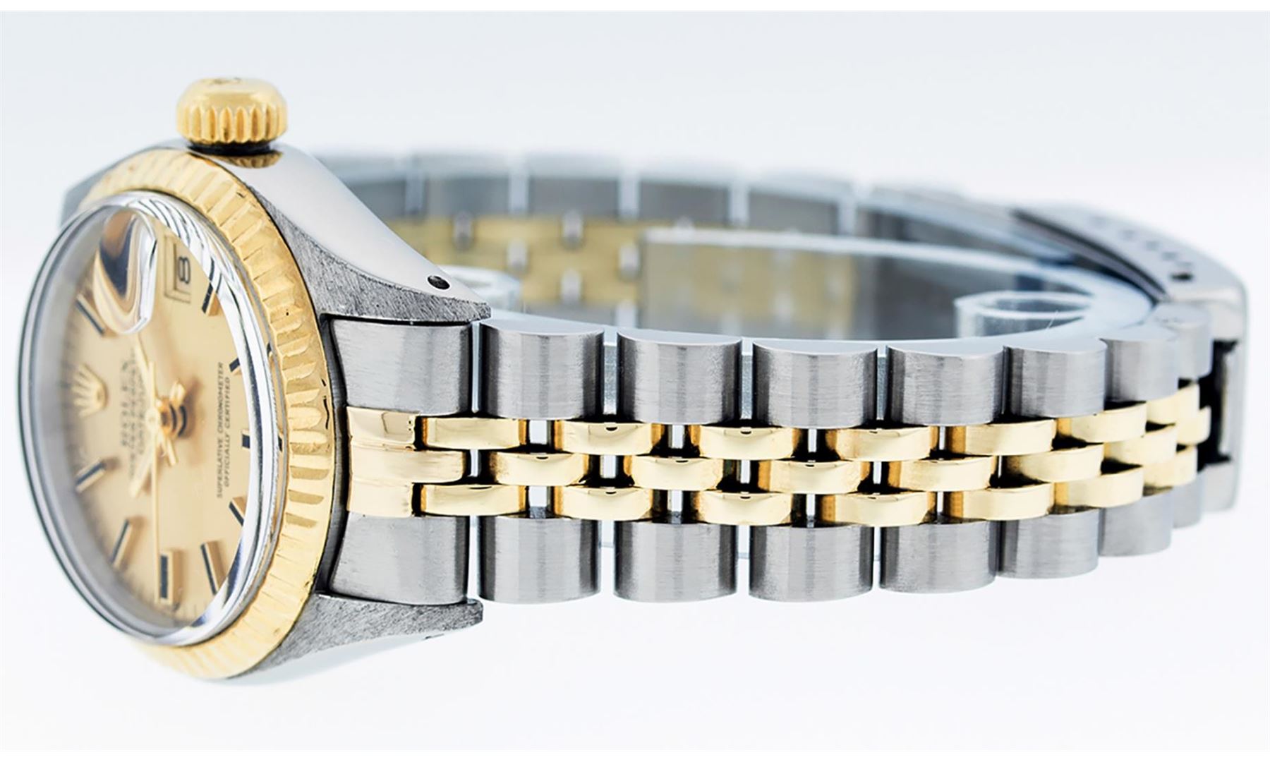 One Ladies Pre Owned Two Tone 14K Yellow Gold & Stainless Steel Rolex Polished, Serviced & Electronically Tested, Rolex Yellow Gold & Stainless Steel Case: 26mm, Rolex Yellow Gold Crown, Rolex Bezel: 14K Yellow Gold Fluted Bezel. Custom Crystal: New Plexiglass With Date Window. Custom Hands: New Luminescent Hands. Rolex Movement: Automatic Winding Movement 2030. Rolex Dial: Champagne Index With Dash Track & Lumi Dots. Date Window: 3 O'Clock Position Date Display, Model: Datejust. Condition: G-6 Extra Fine. Rolex Bracelet: Two Tone 14K Yellow Gold & Stainless Steel Jubilee Band. Bright Polish. 6.0 Inch Length, Adjustable. Standard Clasp, With Rolex Logo. This Watch Has Been Serviced Time Tested And Is In Excellent Condition It Is Free Of All Scratches And Dents.
