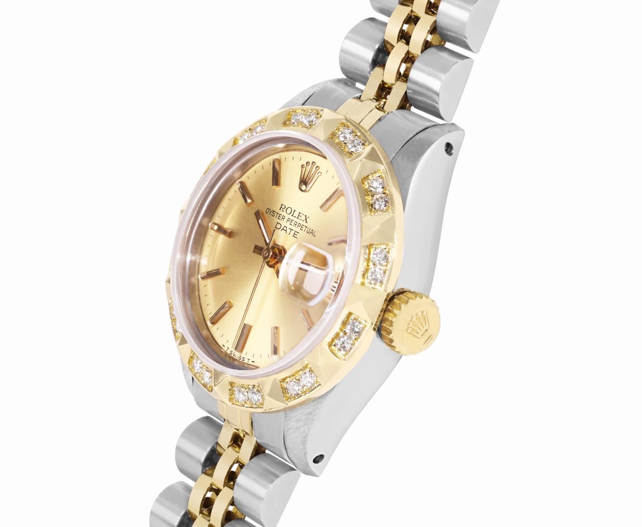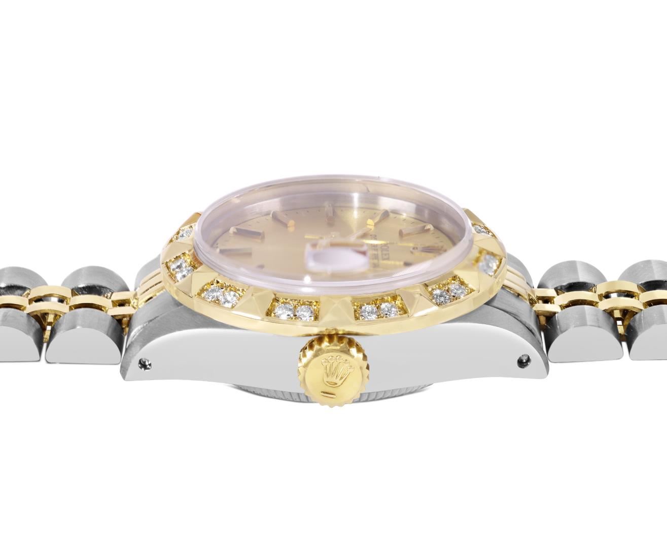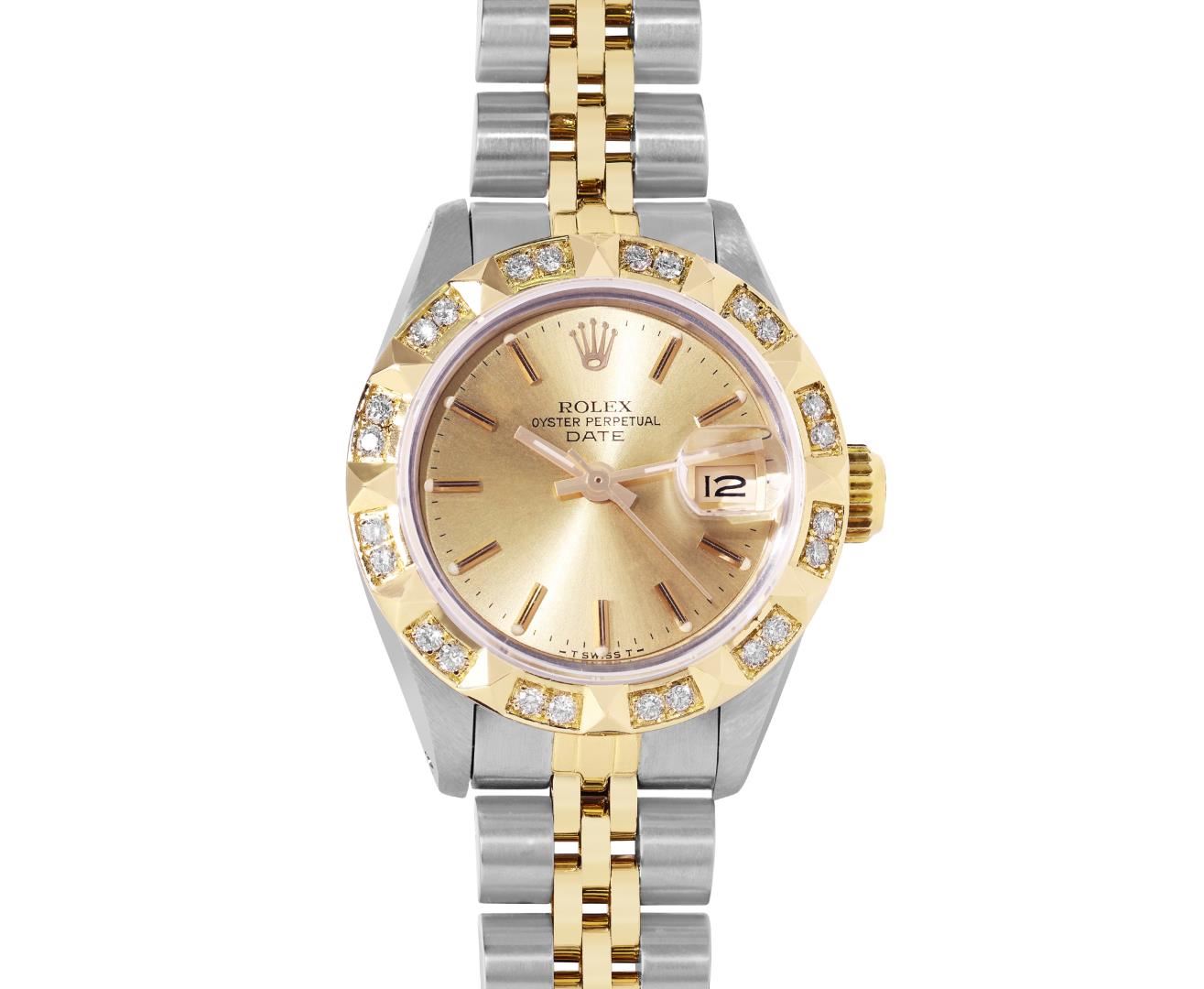 One Rolex Ladies Pre Owned Two Tone 14K Yellow Gold And Stainless Steel Rolex Date Polished, Serviced And Electronically Tested, Rolex Yellow Gold And Stainless Steel Case: 26mm, Rolex Yellow Gold Crown. Custom Bezel: New 18K Yellow Gold Pyramid Diamond Bezel, Diamond Count: 24 Diamonds On Bezel. Custom Crystal: New Sapphire Crystal With Date Window. Custom Hands: New Luminescent Hands. Rolex Movement: Automatic Winding Movement 2035. Rolex Factory Dial: Champagne With Index Hour Markers, Dash Track, and Lumi Dots. Date Window: 3 O'clock Position Date Display, Condition: G-6 Extra Fine. Rolex Bracelet: Two Tone 14K Yellow Gold And Stainless Steel Jubilee Band. Bright Polish & Satin Finish. 6.0 Inch Length, Adjustable. Standard Clasp, With Rolex Logo. This Watch Has Been Serviced Time Tested And Is In Excellent Condition It Is Free Of All Scratches And Dents. This Watch Comes With A Rolex Box.