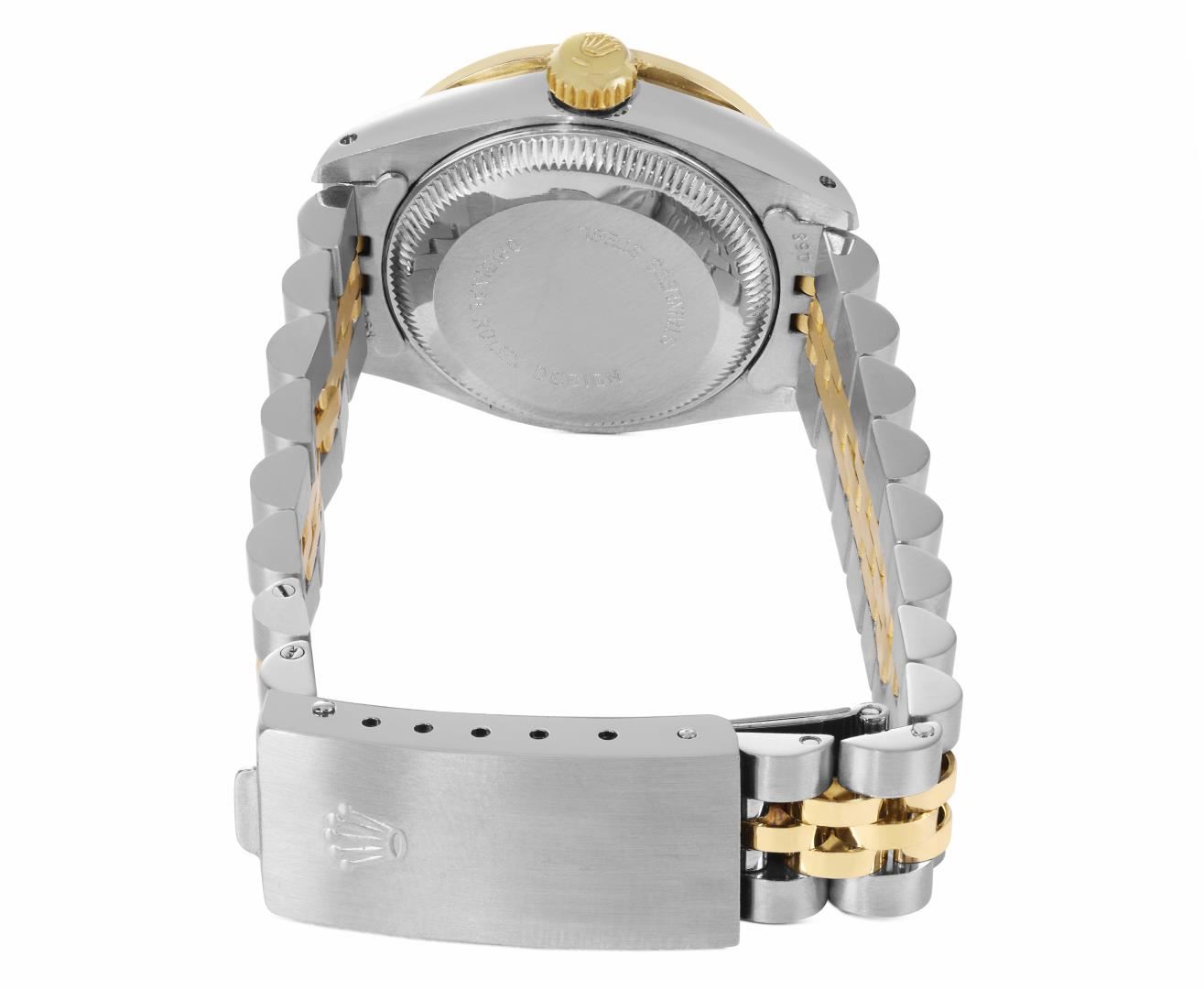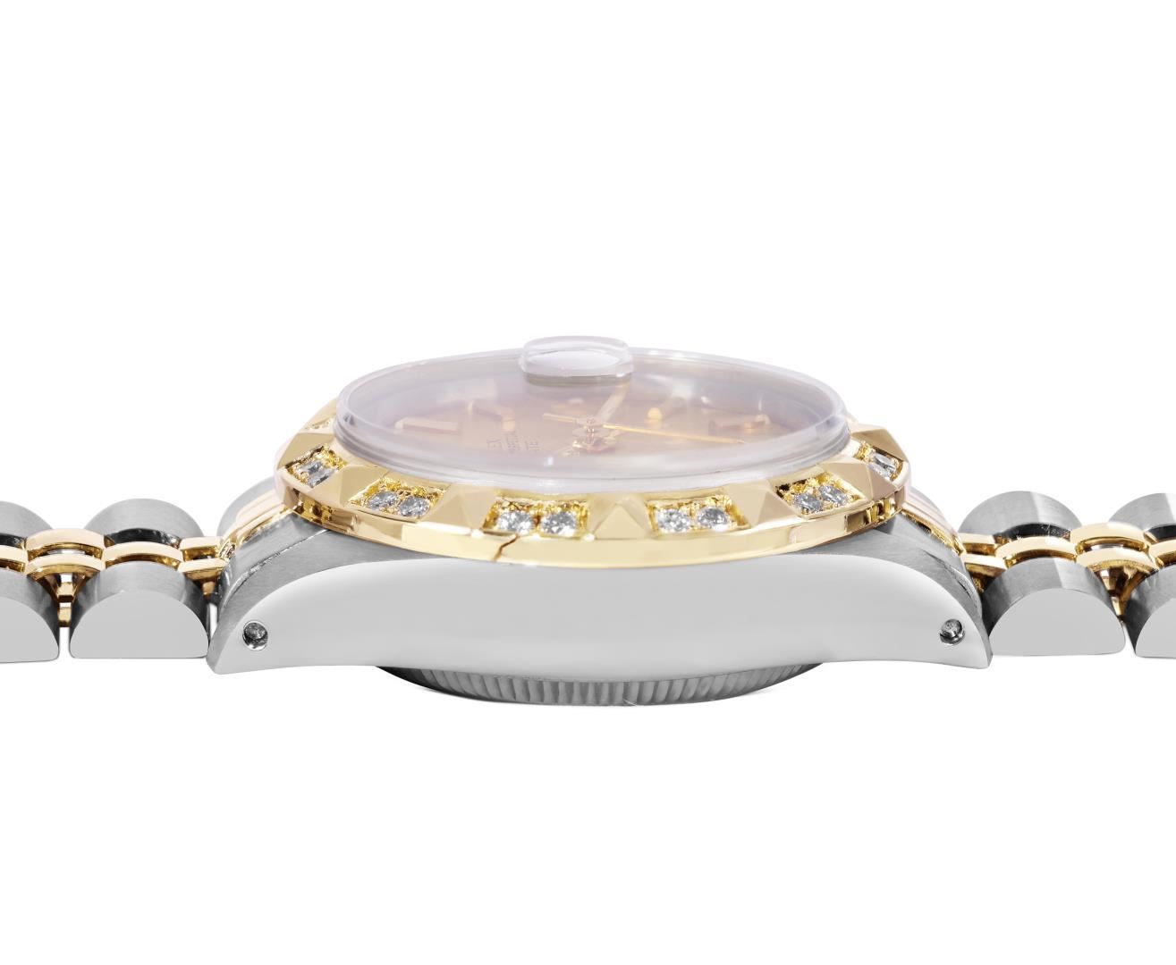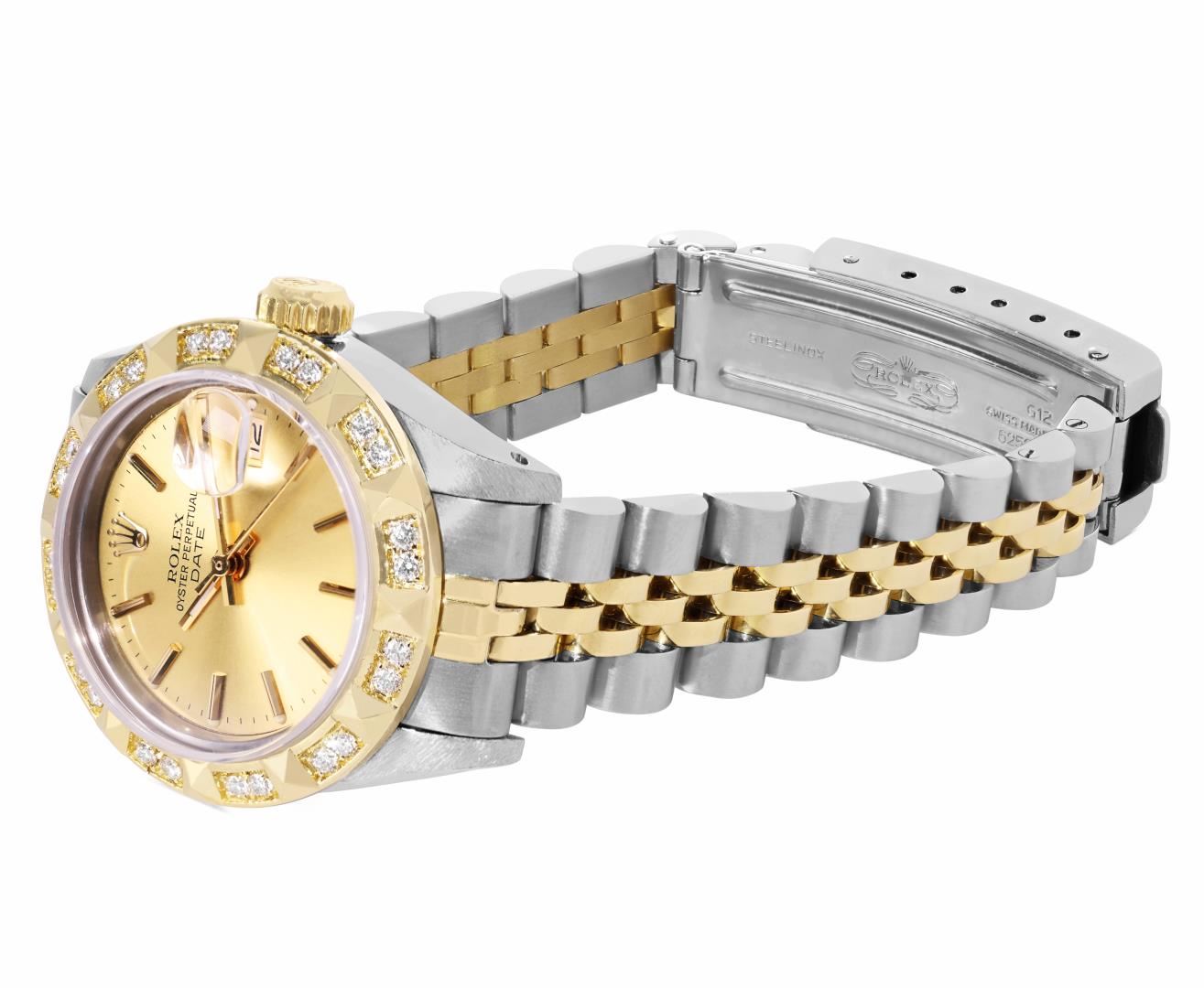 One Rolex Ladies Pre Owned Two Tone 14K Yellow Gold And Stainless Steel Rolex Date Polished, Serviced And Electronically Tested, Rolex Yellow Gold And Stainless Steel Case: 26mm, Rolex Yellow Gold Crown. Custom Bezel: New 18K Yellow Gold Pyramid Diamond Bezel, Diamond Count: 24 Diamonds On Bezel. Custom Crystal: New Sapphire Crystal With Date Window. Custom Hands: New Luminescent Hands. Rolex Movement: Automatic Winding Movement 2035. Rolex Factory Dial: Champagne With Index Hour Markers, Dash Track, and Lumi Dots. Date Window: 3 O'clock Position Date Display, Condition: G-6 Extra Fine. Rolex Bracelet: Two Tone 14K Yellow Gold And Stainless Steel Jubilee Band. Bright Polish & Satin Finish. 6.0 Inch Length, Adjustable. Standard Clasp, With Rolex Logo. This Watch Has Been Serviced Time Tested And Is In Excellent Condition It Is Free Of All Scratches And Dents. This Watch Comes With A Rolex Box.