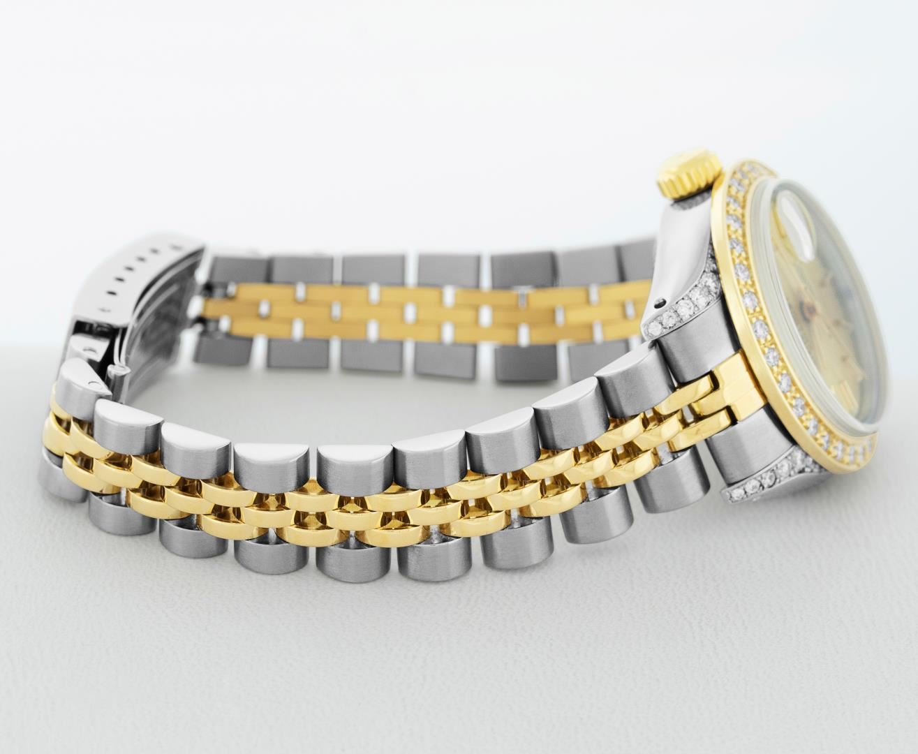 One Pre Owned Quickset Ladies Two Tone 18K Yellow Gold & Stainless Rolex Polished, Serviced & Electronically Tested, Rolex 18K Yellow Gold & Stainless Steel Case: 26mm, Custom Diamond Lugs: Added Diamonds On Lugs, Diamond Count: 24 Diamonds On Lugs. Rolex Yellow Gold Crown, Custom Bezel: New 18K Yellow Gold Diamond Bezel, Diamond Count: 32 Diamonds, Clarity: SI-VS, Color: G to H. Custom Crystal: New Sapphire With Magnified Date Window. Custom Hands: New Gold Hands. Rolex Movement: Automatic Quickset Winding Movement. Rolex Dial: Champagne Index With Lumi Dots And Dash Track. Date Window: 3 O'Clock Position Date Display, Model: Date, Condition: G-6 Extra Fine. Rolex Bracelet: Two Tone 18K Yellow Gold & Stainless Steel Jubilee Band. Bright Polish. 6.0 Inch Length, Adjustable. Standard Clasp, With Rolex Logo. This Watch Has Been Serviced Time Tested And Is In Excellent Condition It Is Free Of All Scratches And Dents.