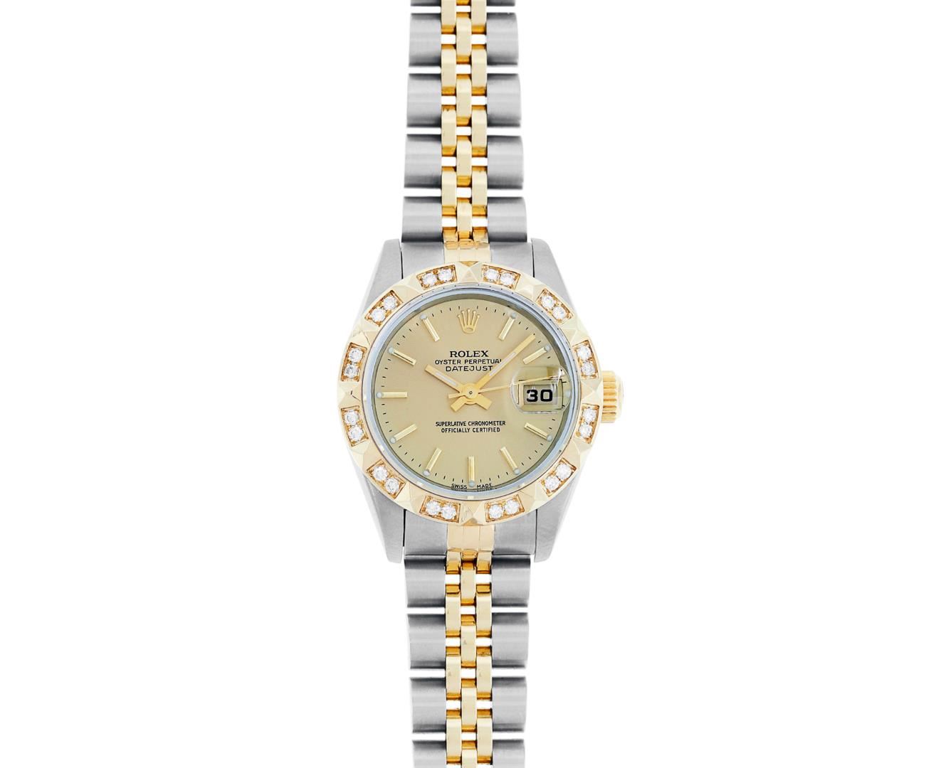 One Pre Owned Quickset Ladies Two Tone 18K Yellow Gold & Stainless Rolex Polished, Serviced & Electronically Tested, Rolex 18K Yellow Gold & Stainless Steel Case: 26mm. Rolex Yellow Gold Crown, Custom Bezel: New 18K Yellow Gold Pyramid Bezel, Diamond Count: 24 Diamonds On Bezel, Clarity: SI-VS, Color: G to H. Custom Crystal: New Sapphire With Magnified Date Window. Custom Hands: New Lumi Hands. Rolex Movement: Automatic Quickset Winding Movement 2235. Rolex Dial: Champagne Index With Lumi Dots And Dash Track. Date Window: 3 O'Clock Position Date Display, Model: Quickset Datejust, Condition: G-6 Extra Fine. Rolex Bracelet: Two Tone 18K Yellow Gold & Stainless Steel Jubilee Band. Bright Polish. 6.0 Inch Length, Adjustable. Standard Clasp, With Rolex Logo. This Watch Has Been Serviced Time Tested And Is In Excellent Condition It Is Free Of All Scratches And Dents.