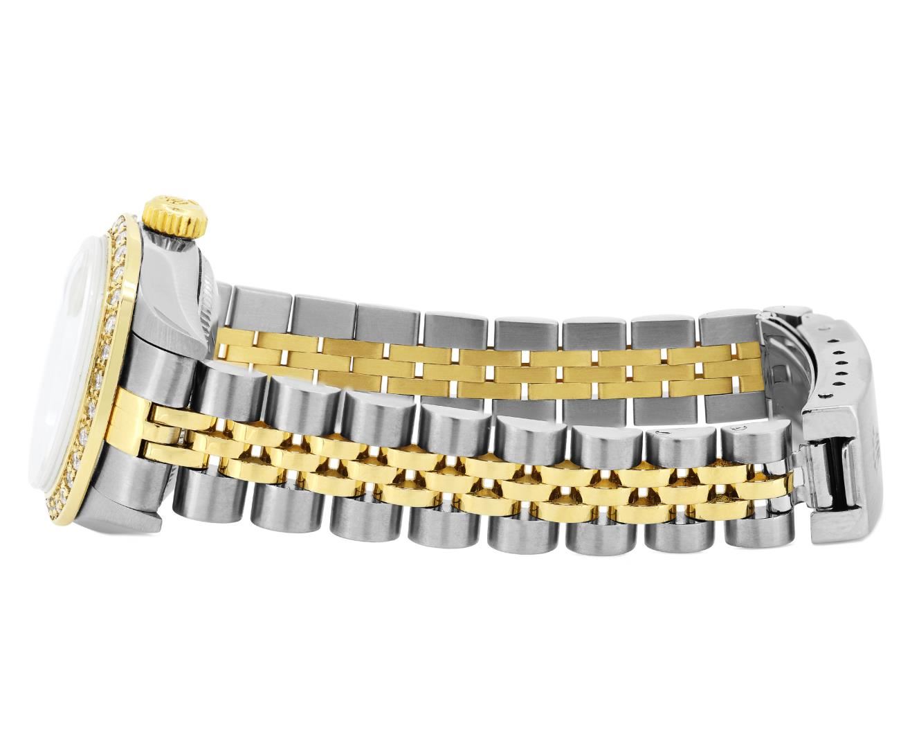 One Rolex Sapphire Ladies Pre Owned Two Tone 18K Yellow Gold And Stainless Steel Rolex Datejust Polished, Serviced And Electronically Tested, Rolex Yellow Gold And Stainless Steel Case: 26mm, Rolex Yellow Gold Crown. Custom Bezel: New 18K Yellow Gold Beadset Diamond Bezel, Diamond Count: 32 Diamonds On Bezel. Crystal: Sapphire Crystal With Date Window. Hands: Luminescent Hands. Rolex Movement: 2235 Automatic Winding Movement. Rolex Factory Dial: Champagne With Index Hour Markers And Dash Track, and Lumi Dots. Date Window: 3 O'Clock Position Date Display, Condition: G-6 Extra Fine. Rolex Bracelet: Two Tone 18K Yellow Gold & Stainless Steel Jubilee Band. Bright Polish & Satin Finish. 6.0 Inch Length, Adjustable. Standard Clasp, With Rolex Logo. This Watch Has Been Serviced Time Tested And Is In Excellent Condition It Is Free Of All Scratches And Dents.
