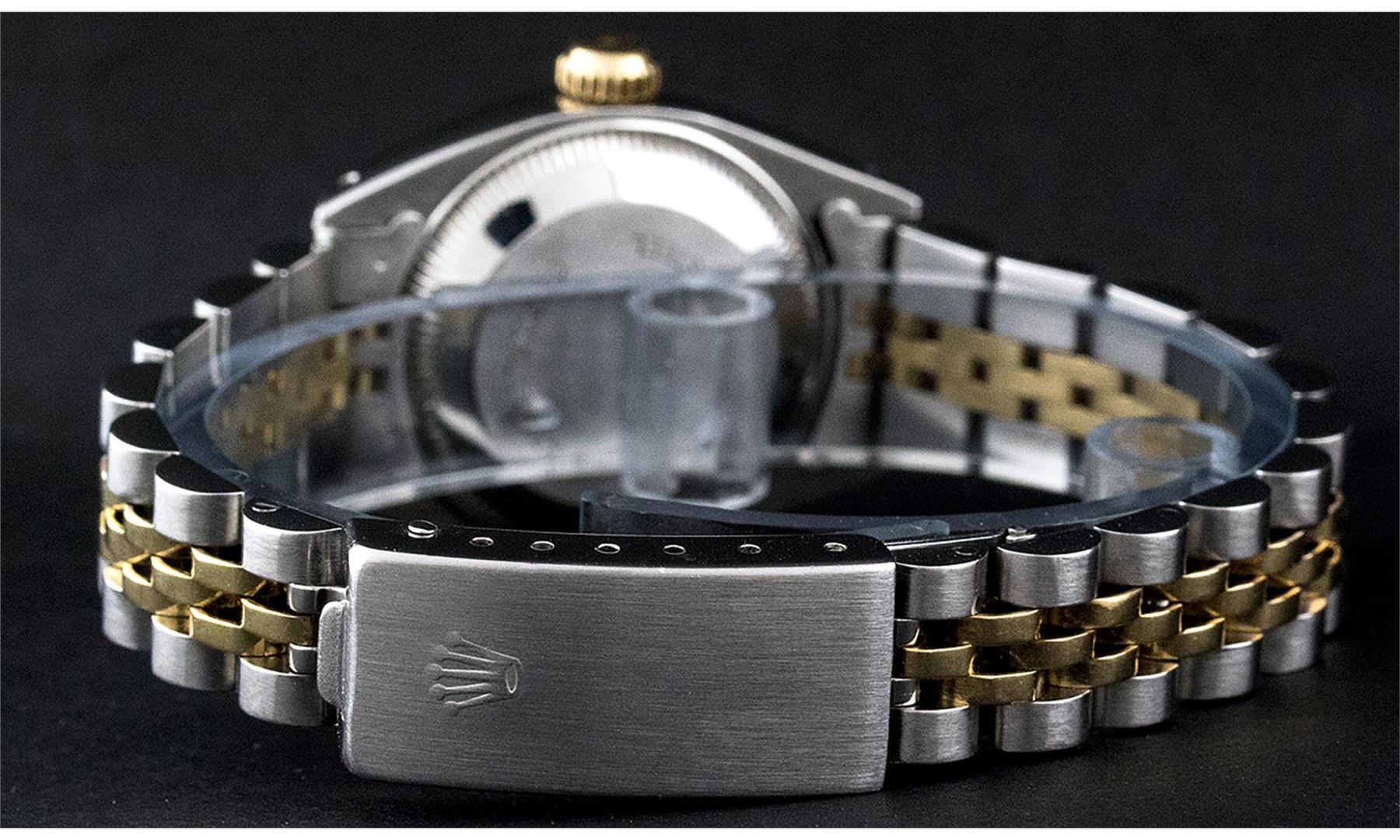 One Ladies Pre Owned Two Tone 14K Yellow Gold & Stainless Steel Rolex Polished, Serviced & Electronically Tested, Rolex Yellow Gold & Stainless Steel Case: 26mm, Rolex Yellow Gold Crown, Rolex Bezel: 14K Yellow Gold Fluted Bezel. Custom Crystal: New Plexiglass With Date Window. Hands: Luminescent Hands. Rolex Movement: Automatic Winding Movement 2030. Rolex Dial: Champagne Roman With Square Track. Date Window: 3 O'Clock Position Date Display, Model: Datejust. Condition: G-6 Extra Fine. Rolex Bracelet: Two Tone 14K Yellow Gold & Stainless Steel Jubilee Band. Bright Polish. 6.0 Inch Length, Adjustable. Standard Clasp, With Rolex Logo. This Watch Has Been Serviced Time Tested And Is In Excellent Condition It Is Free Of All Scratches And Dents.