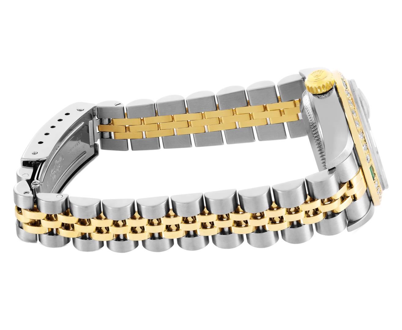 One Ladies Pre Owned Quickset Stainless Steel Rolex Datejust Polished Bright with Satin Finish, Serviced & Electronically Tested, Rolex Stainless Steel Case: 26mm, Rolex Yellow Gold Crown, Custom Bezel: New 18K Yellow Gold Diamond & Emerald Bezel, Stone Count: 28 Diamonds + 4 Emeralds On Bezel. Crystal: Sapphire With Magnified Date Window. Hands: Luminescent Hands. Rolex Movement: Automatic Winding Movement. Rolex Dial: Champagne with Roman Hour Markers and Square Track. Date Window: 3 O'clock Position Date Display, Model: Quickset Datejust. Condition: G-6 Extra Fine. Rolex Bracelet: 18K Yellow Gold And Stainless Steel Jubilee Band. Bright Polish & Satin Finish. 6.0 Inch Length, Adjustable. Standard Clap, With Rolex Logo. This Watch Has Been Serviced Time Tested And Is In Excellent Condition It Is Free Of All Scratches And Dents.