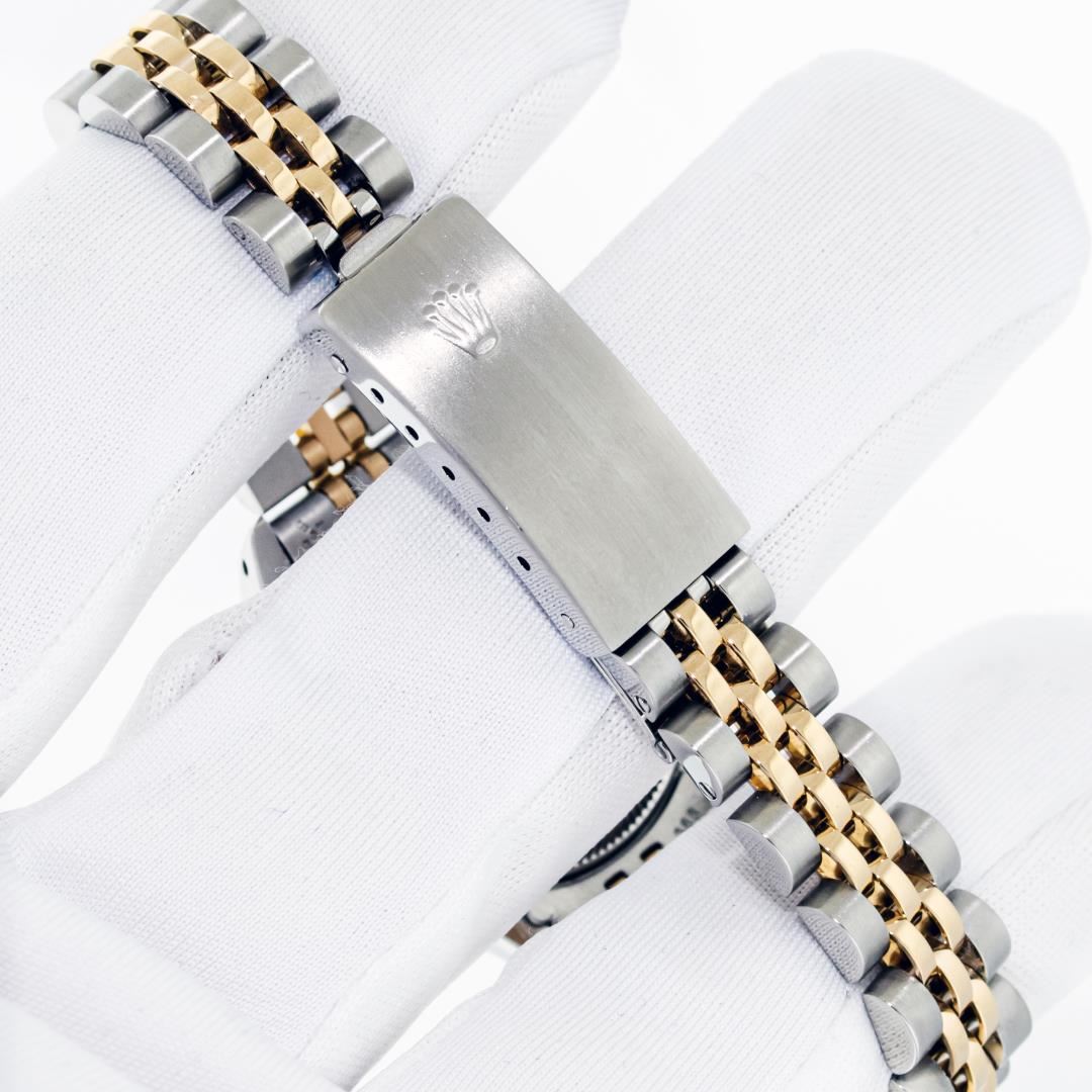 Rolex Ladies Pre Owned Quickset 18K Yellow Gold and Stainless Steel Two Tone Wristwatch Polished Bright with Satin Finish, Serviced & Electronically Tested, Rolex Stainless Steel Case: 26mm, Custom Diamond Lugs: Added Diamonds On Lugs, Diamond Count: 24 Diamonds On Lugs, Color: G To H, Clarity: SI-VS. Rolex Yellow Gold Crown, Custom Bezel: New 18K Yellow Gold Beadset And Sapphire Diamond Bezel, Stone Count: 28 Diamonds + 4 Sapphires On Bezel. Custom Crystal: New Sapphire With Magnified Date Window. Custom Hands: New Hands. Rolex Movement: Automatic Winding Movement. Rolex Dial: Champagne Dial With Dash Track & Lumi Dots, Date Window: 3 O'Clock Position Date Display, Model: Quickset Datejust, Condition: G-6 Extra Fine. Rolex Bracelet: Stainless Steel and 18K Yellow Gold Jubilee Band. Bright Polish & Satin Finish. 6.0 Inch Length, Adjustable. Standard Clasp, With Rolex Logo. This Watch Has Been Serviced Time Tested And Is In Excellent Condition It Is Free Of All Scratches And Dents.