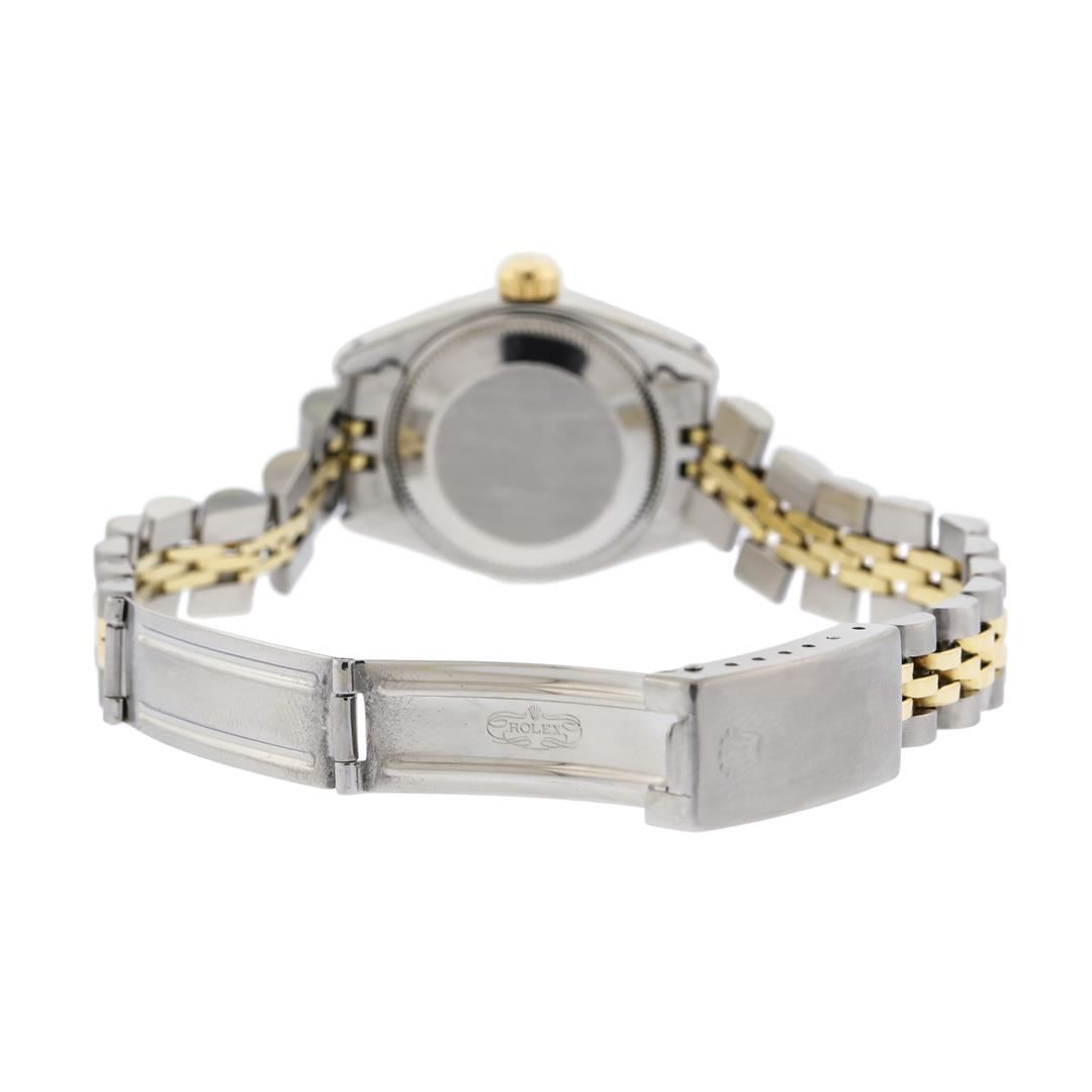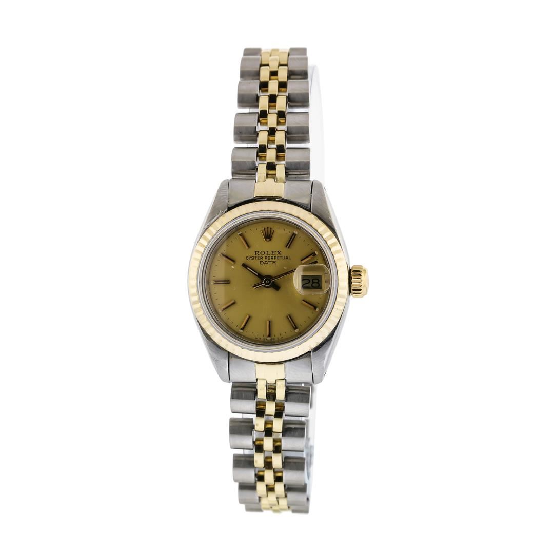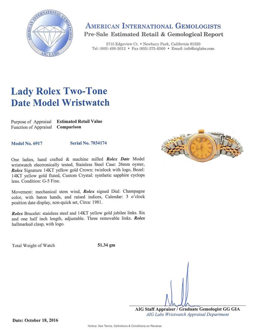 One ladies, hand crafted & machine milled Rolex Date Model wristwatch electronically tested, Stainless Steel Case: 26mm oyster, Rolex Signature 14KT yellow gold Crown: twin lock with logo, Bezel: 14KT yellow gold fluted, Custom Crystal: synthetic sapphire cyclops lens. Condition: G-5 Fine. Movement: mechanical stem wind, Rolex signed Dial: Champagne color, with baton hands, and raised indices, Calendar: 3 o'clock position date display, non-quick set, Circa: 1981.Rolex Bracelet: stainless steel and 14KT yellow gold jubilee links. Six and one half inch length, adjustable. Three removable links. Rolex hallmarked clasp, with logo. Total Weight of Watch 51.34gm. AIG Appraised.