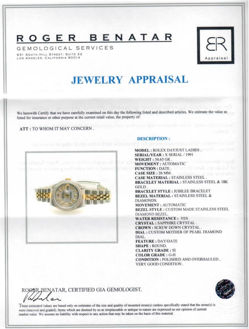 One Rolex Ladies Two Tone Diamond Datejust Wristwatch with a total weight of 54.65 grams. Custom mother of pearl diamond dial. Jubilee bracelet. Case 26mm.